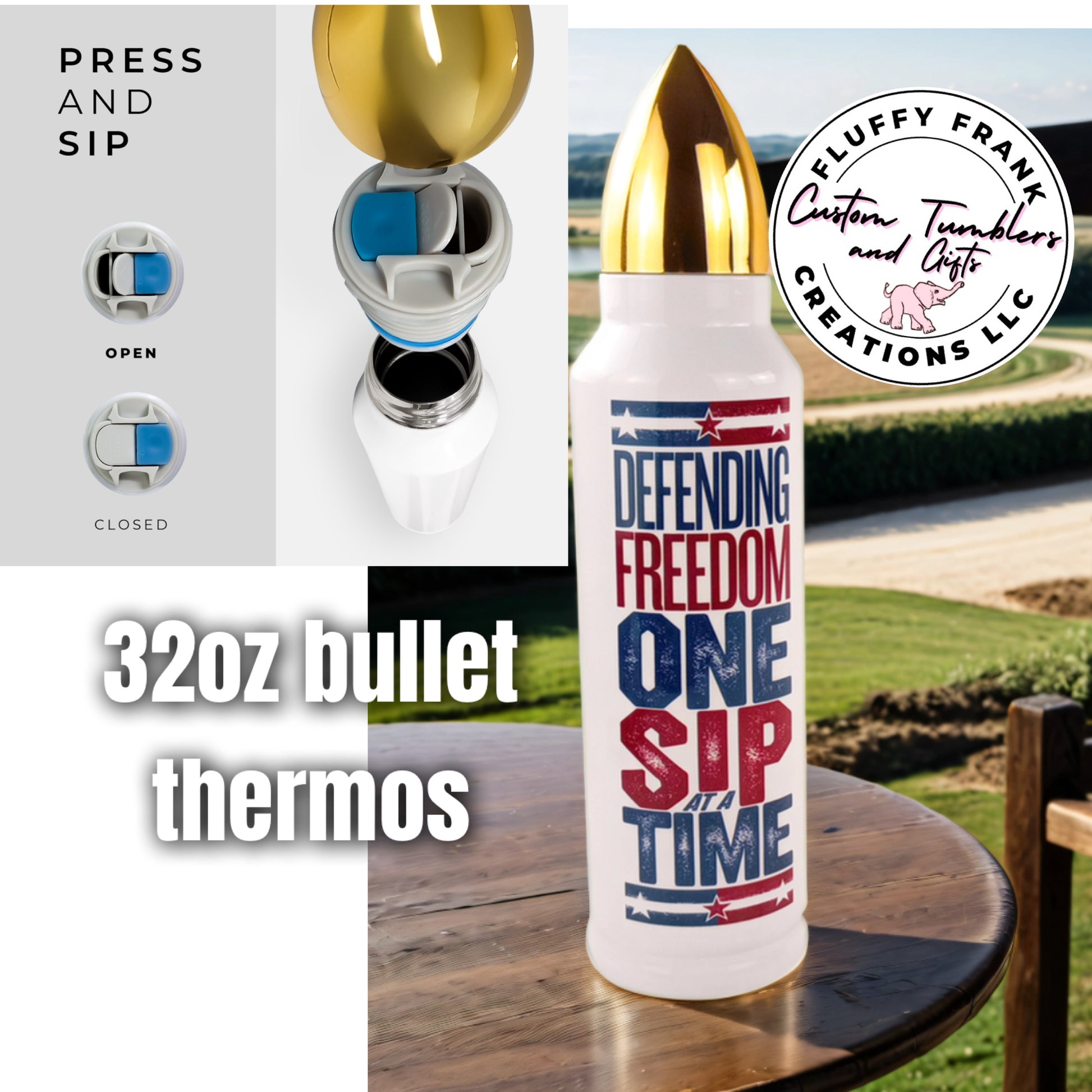 Introducing the perfect gift for military personnel, gun enthusiasts, or anyone who appreciates a touch of personalization. This 32 oz double-walled stainless steel tumbler is not just a drinkware; it's a bullet-shaped canvas ready to showcase your unique style.