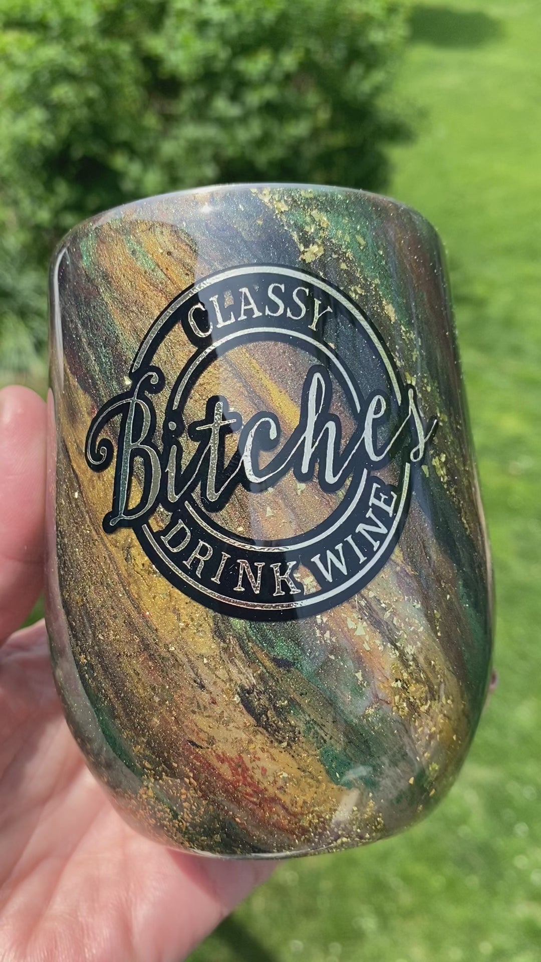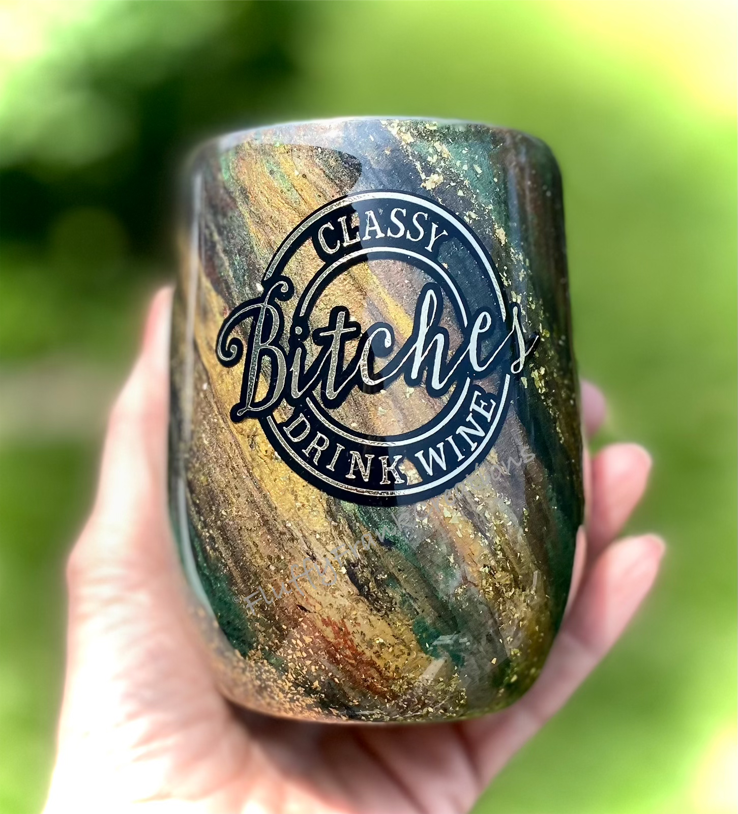 Make a statement with 12 Oz Classy Wine Tumbler! Impress your friends and family with our handmade, double-walled stainless steel tumbler, designed to keep your hot or cold beverages at the perfect temperature for hours. Its green gold swirl design and “Classy bitches drink wine” phrase makes it stand out from the crowd. Every tumbler comes with a sliding plastic lid and straw for added convenience. Get yours now and enjoy a delicious sip of your favorite beverage!