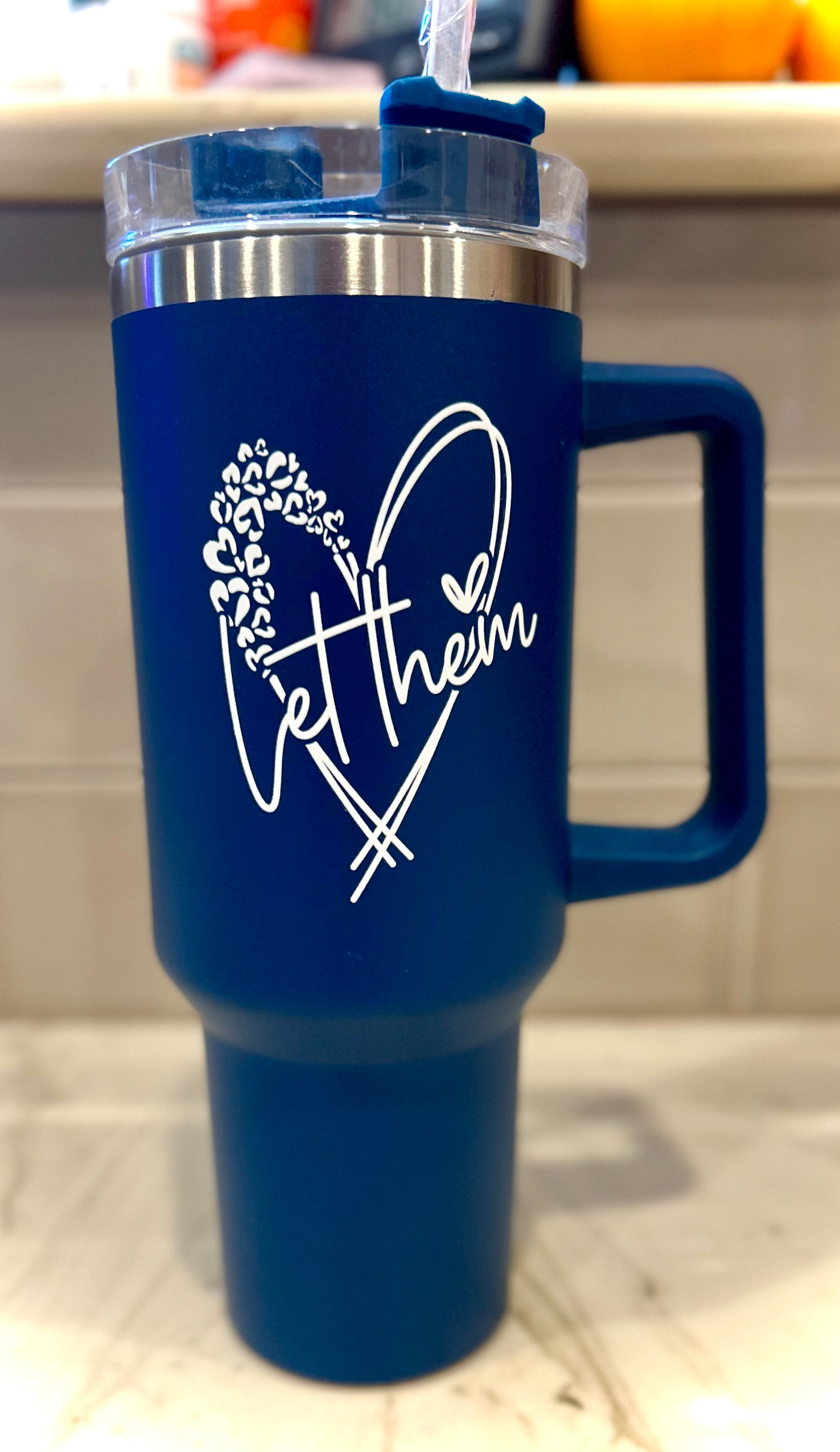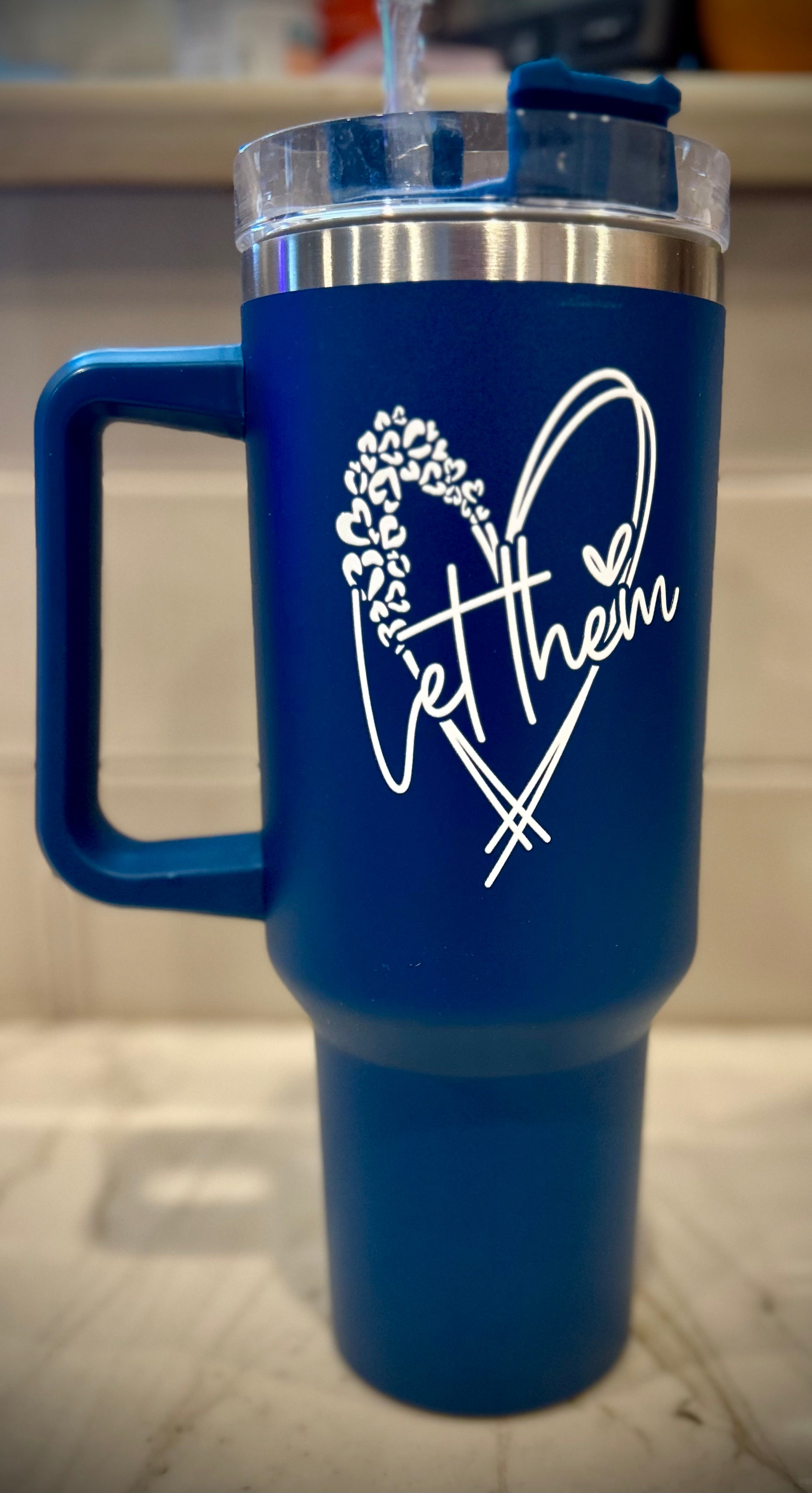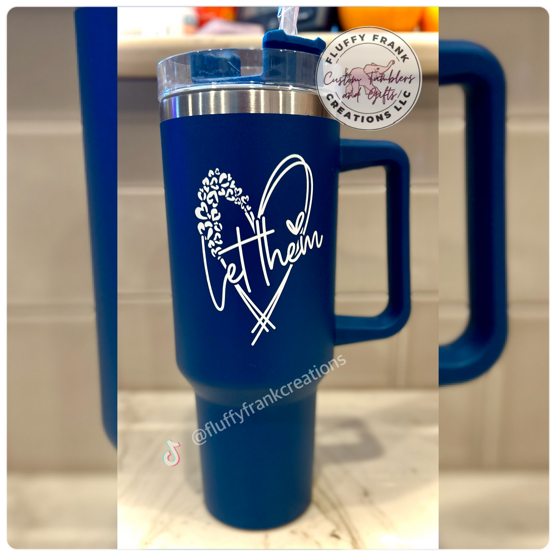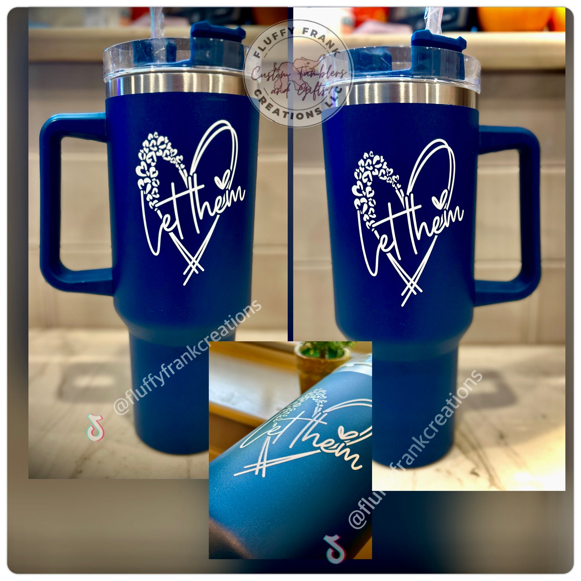 Enjoy your favorite beverage on the go with our "Let Them” 40oz navy blue tumbler! This double-walled stainless steel tumbler can keep your drinks hot for up to 6 hours or cold for up to 12 hours, and comes with a screw-on lid and straw. waterproof UV DTF decal make this tumbler perfect for any occasion. Plus, it fits in most cup holders! Express yourself and keep your drinks at the ideal temperature!!
