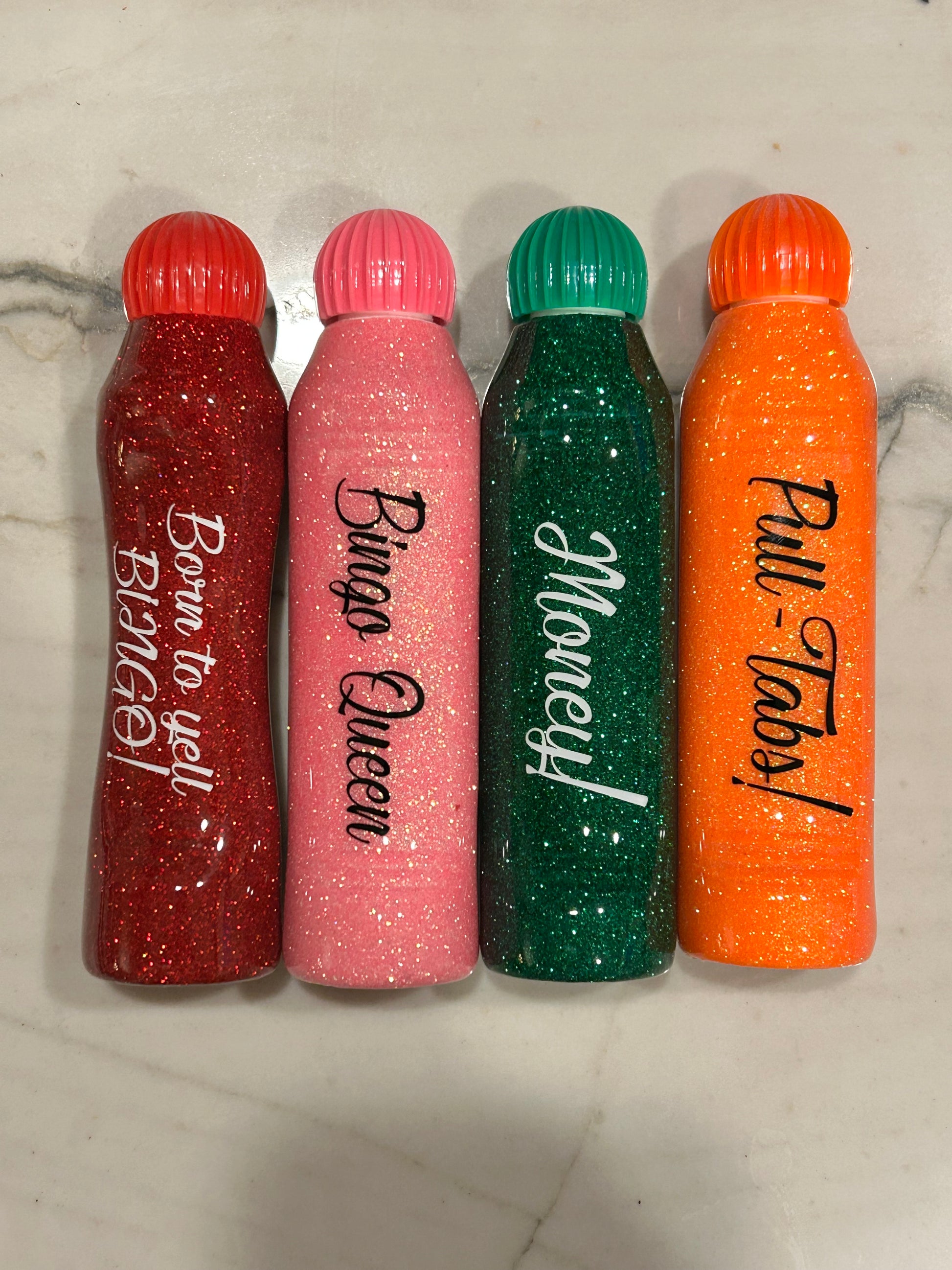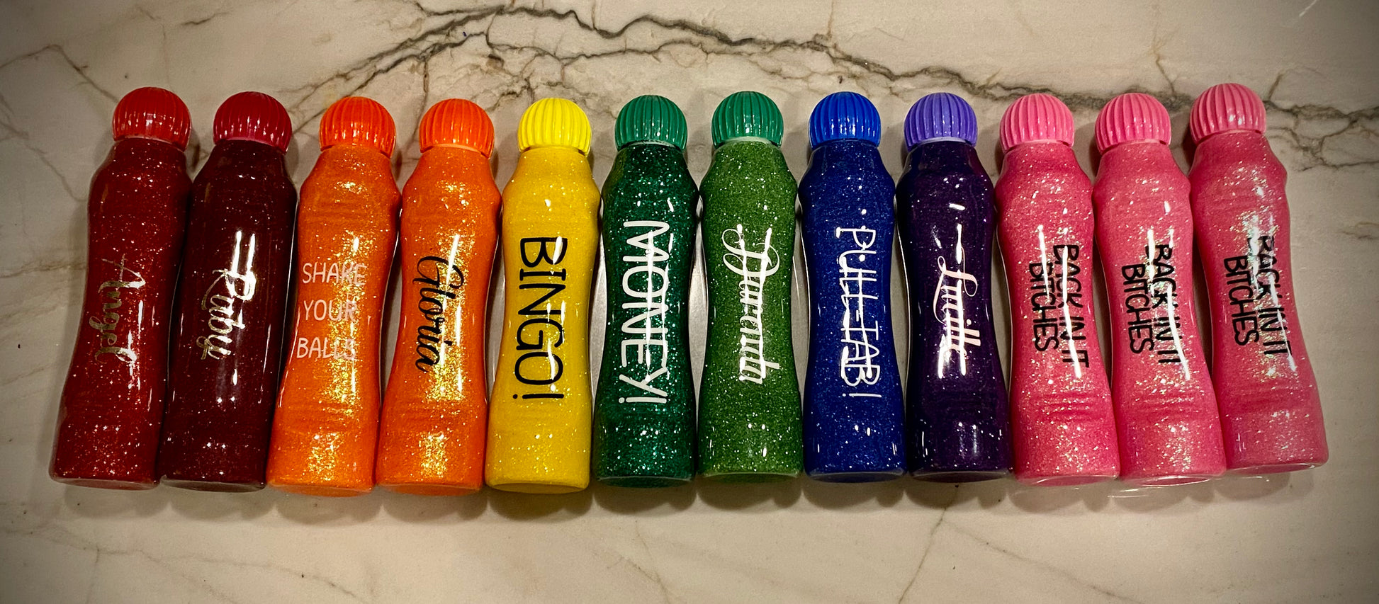 daubers are sanded, painted, glittered then coated with UV resin and glitter of your choice!! Final coat done with 2 part epoxy resin for durability. Lettering is permanent vinyl