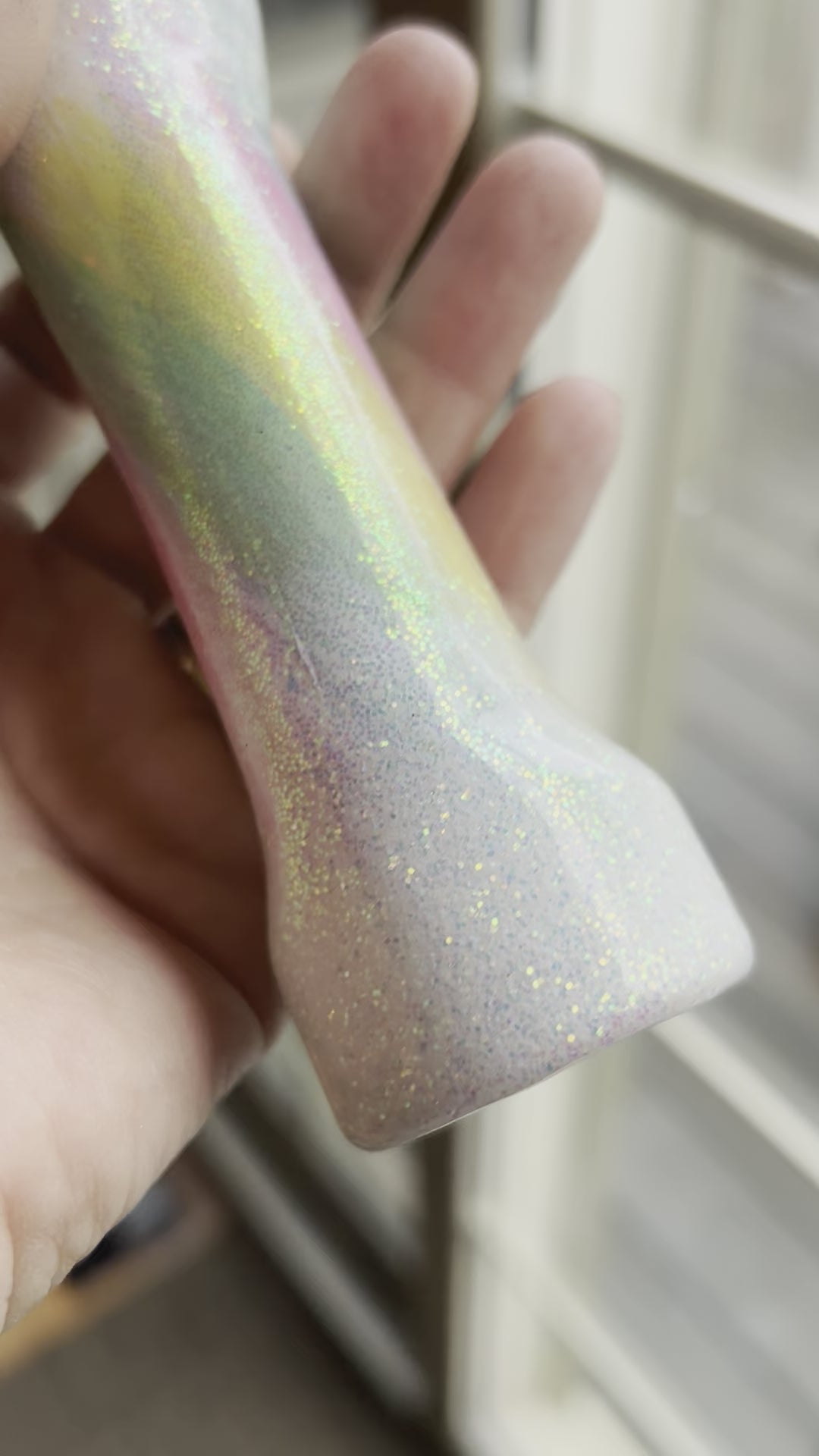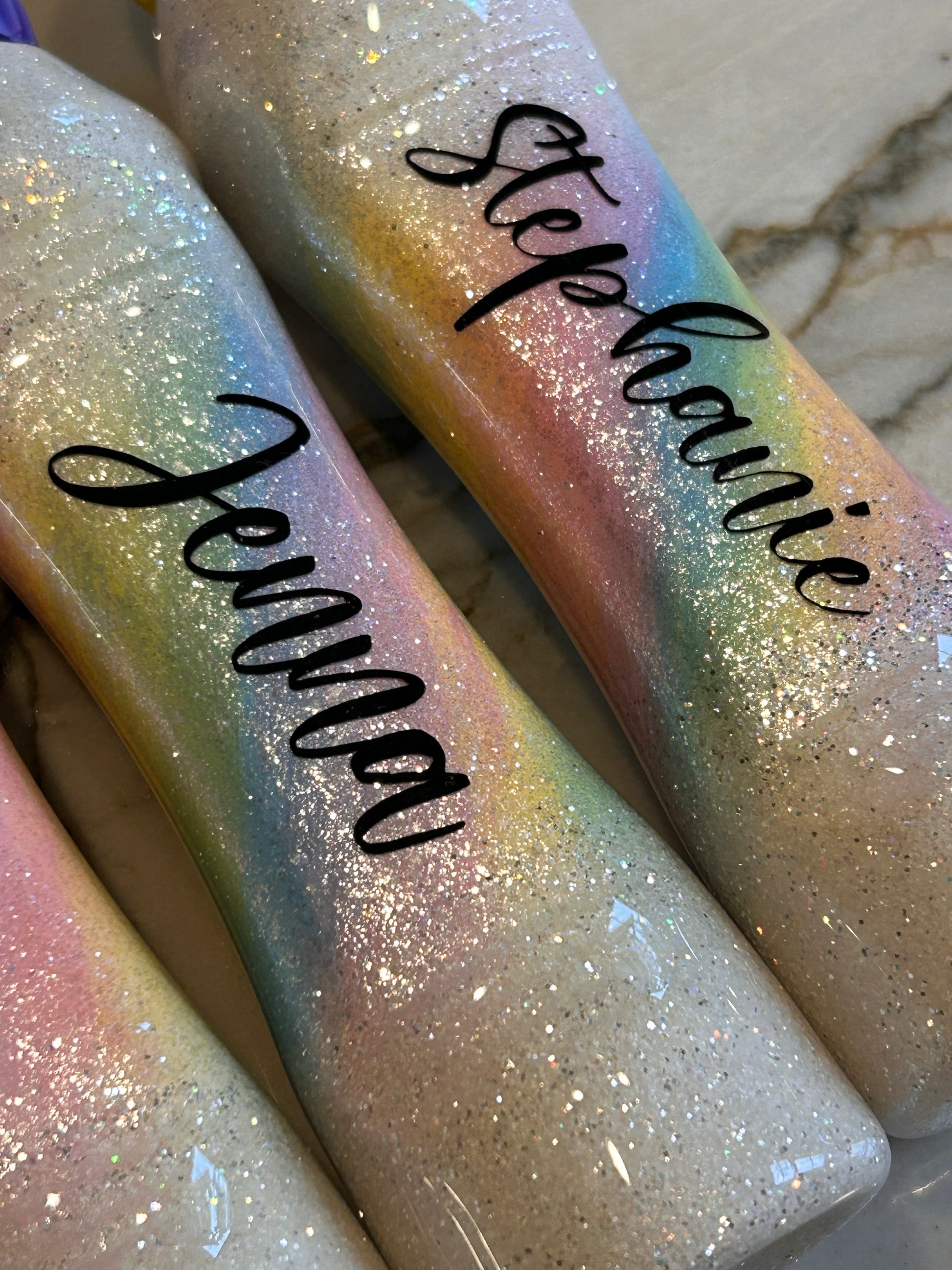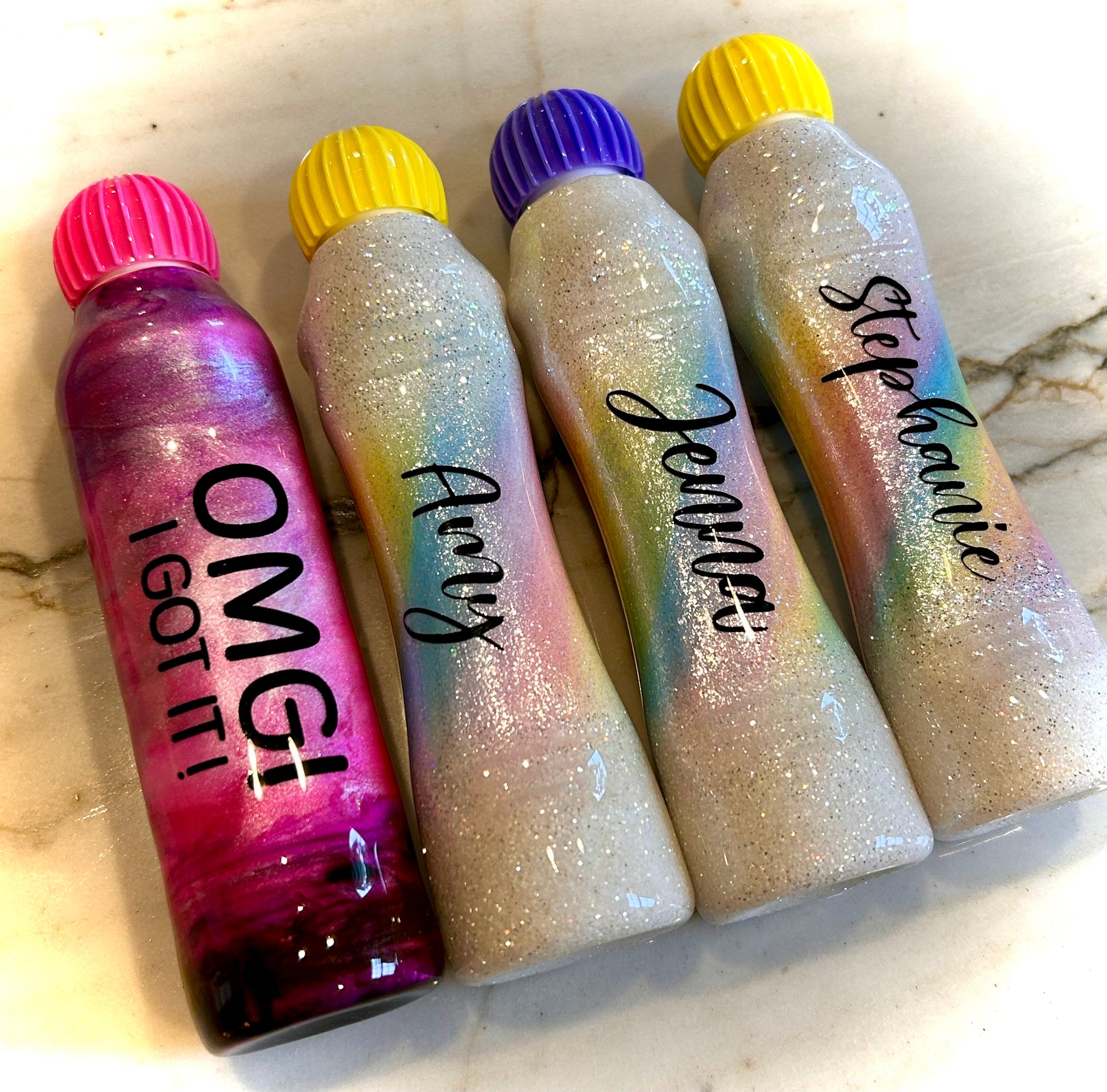 daubers are sanded, painted, glittered then coated with UV resin and glitter!! beautiful pastel / blended color with iridescent glitter on top and bottom. (Final coat done with 2 part epoxy resin for durability. ) Lettering is permanent vinyl and sealed under final coat of epoxy resin