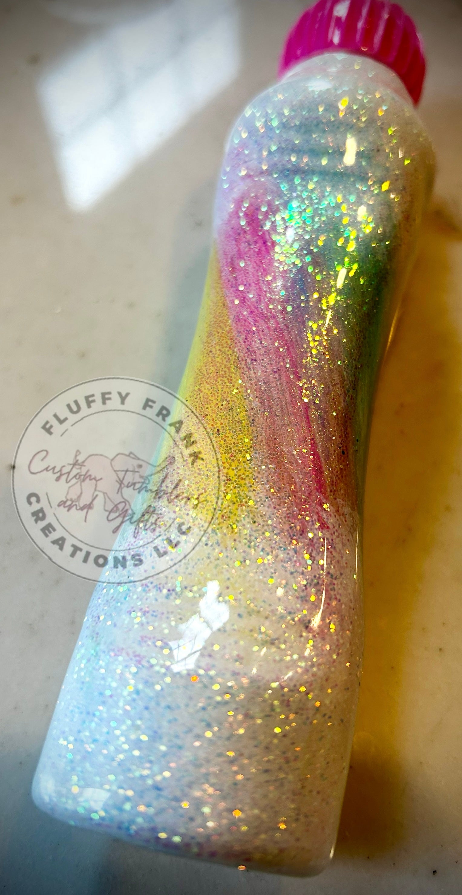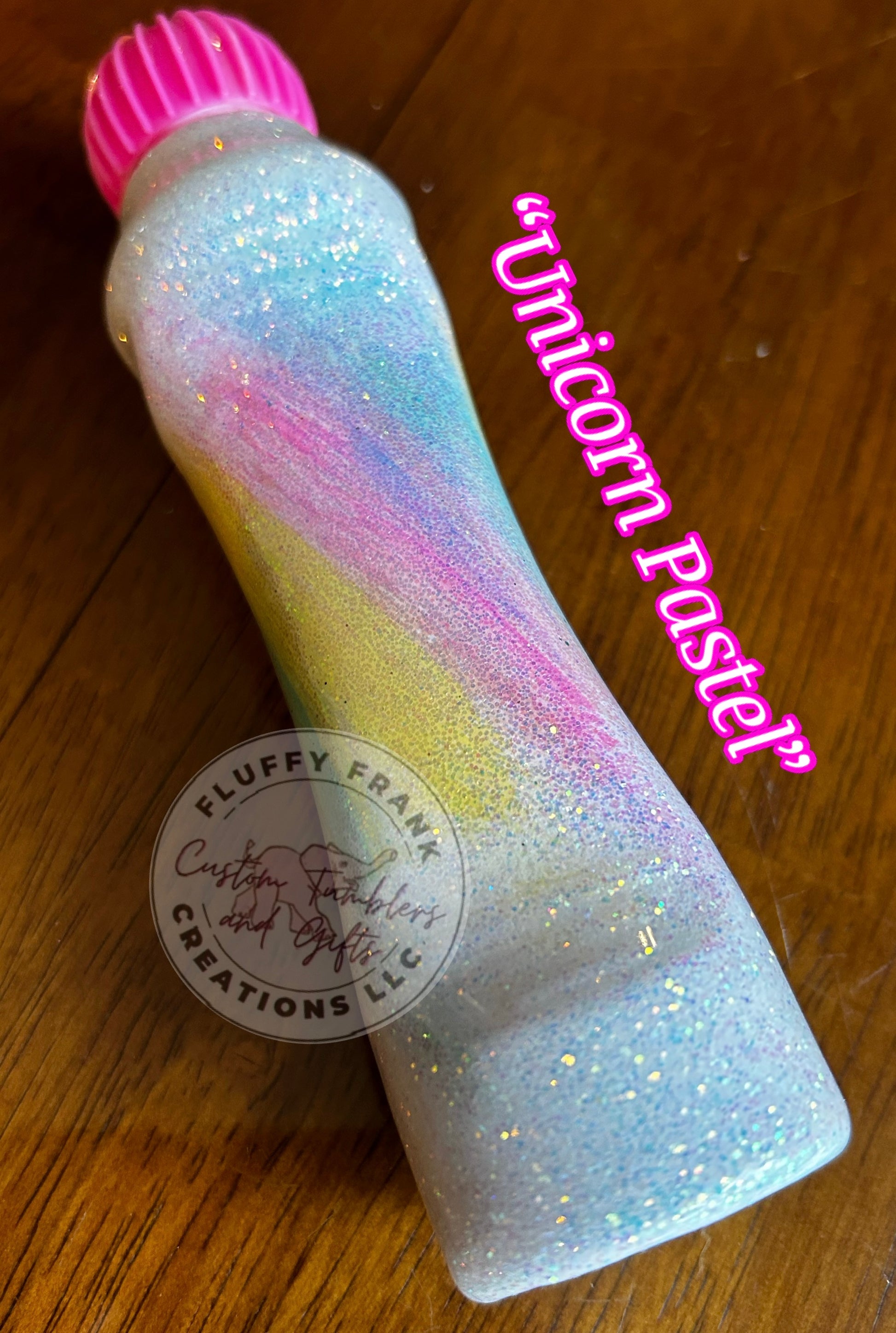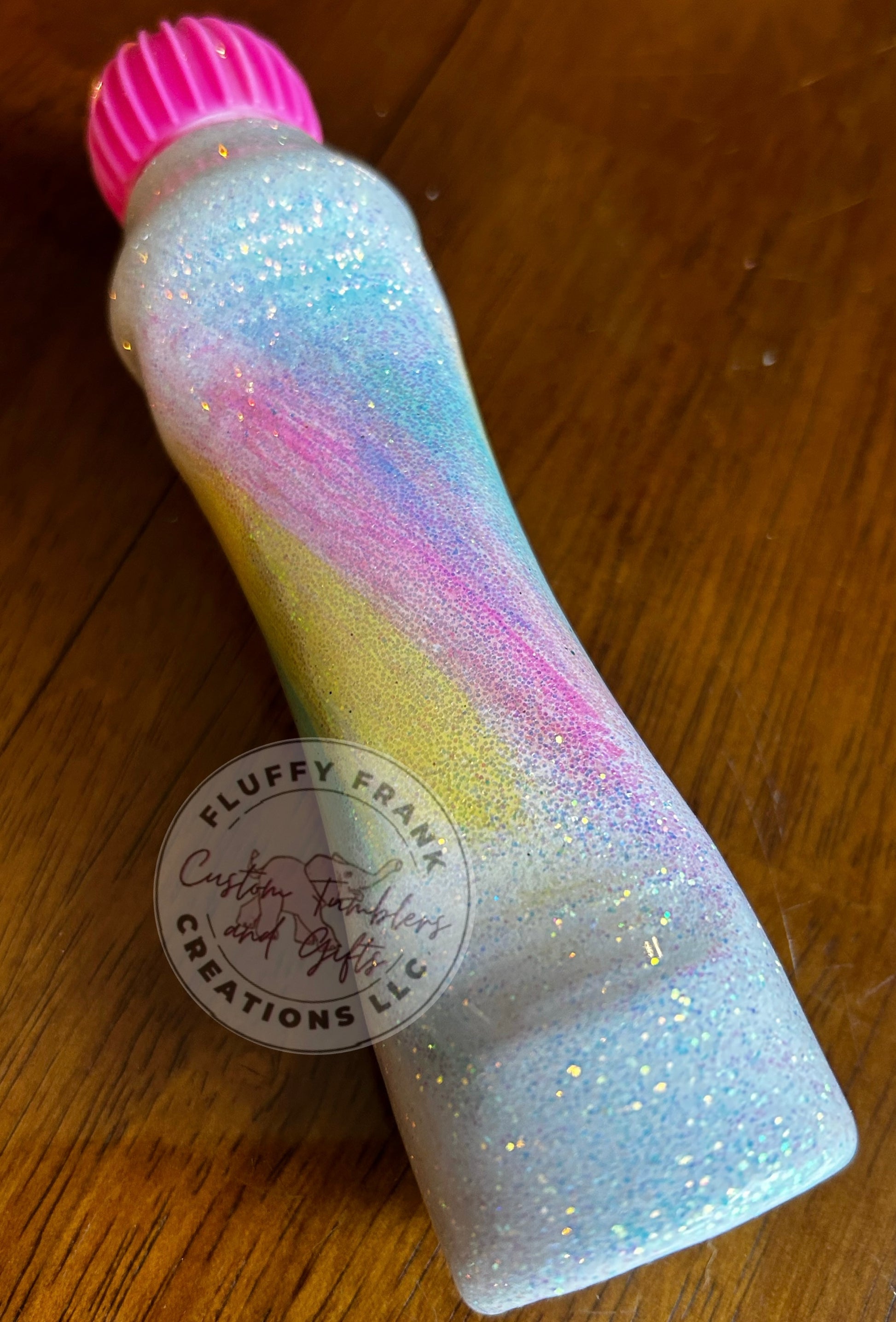 daubers are sanded, painted, glittered then coated with UV resin and glitter!! beautiful pastel / blended color with iridescent glitter on top and bottom. (Final coat done with 2 part epoxy resin for durability. ) Lettering is permanent vinyl and sealed under final coat of epoxy resin