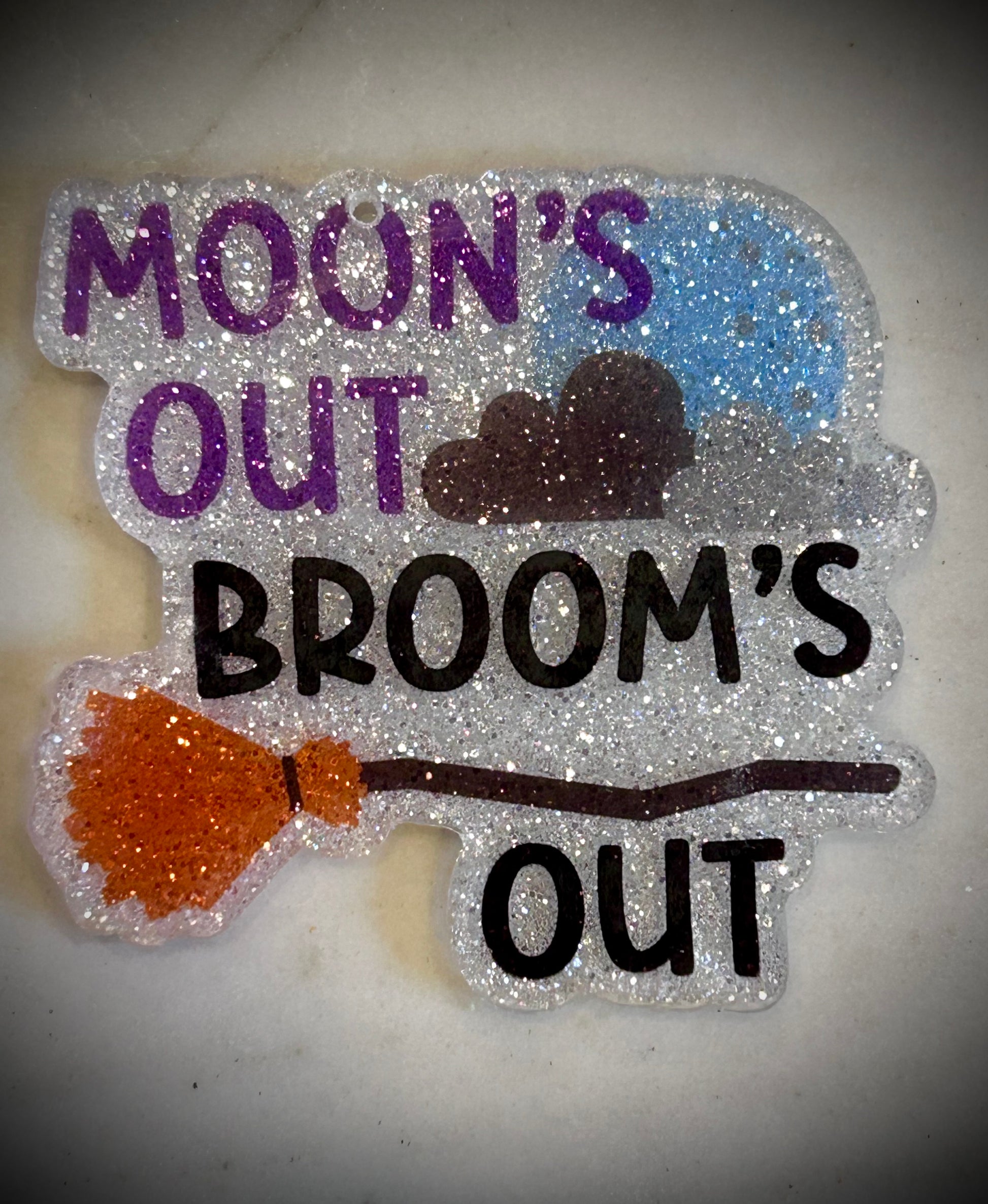 Get ready to cast a spell on your keys with this adorable and spooky keychain! This 3-inch clear acrylic keychain features a playful, glittery design with the phrase "Moon's Out, Broom's Out" and a charming cloud and broom. It's the perfect accessory for any witchy wardrobe or Halloween lover.
