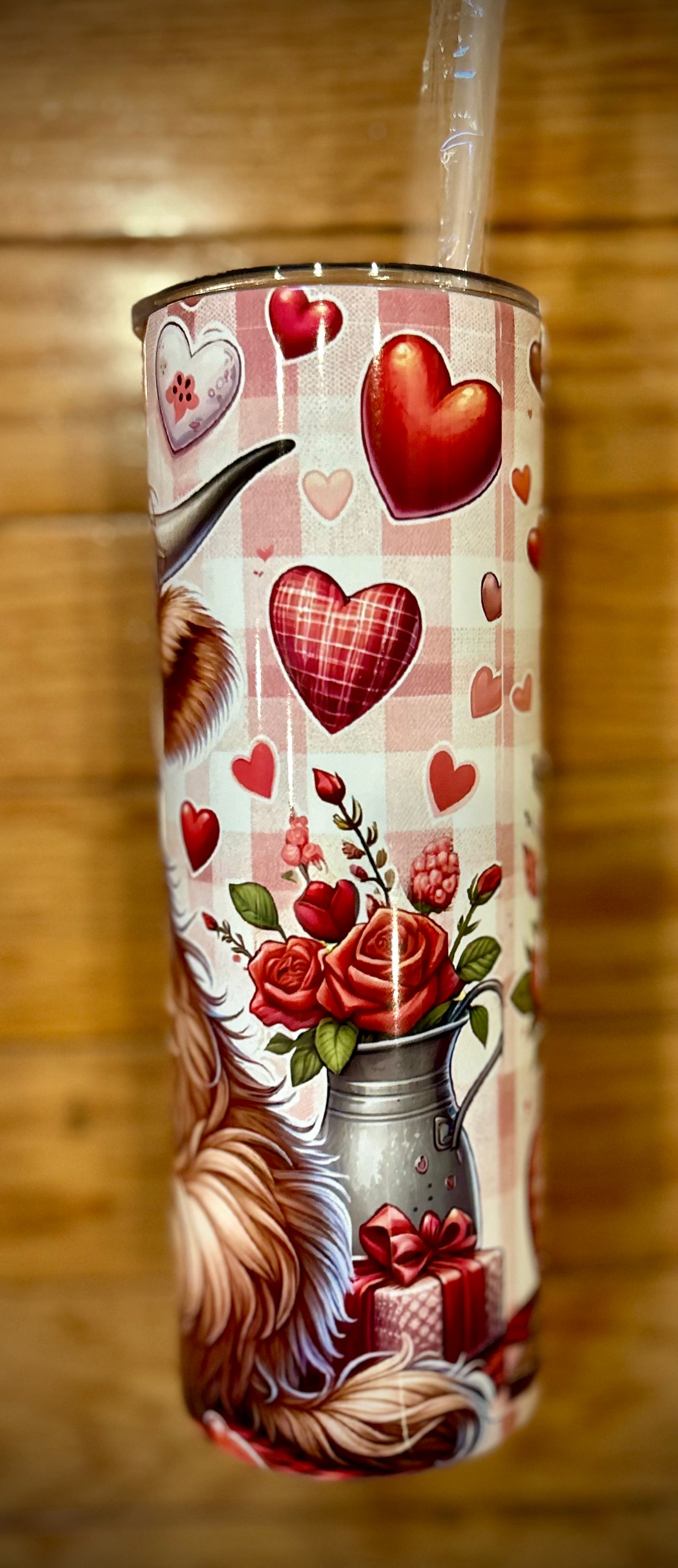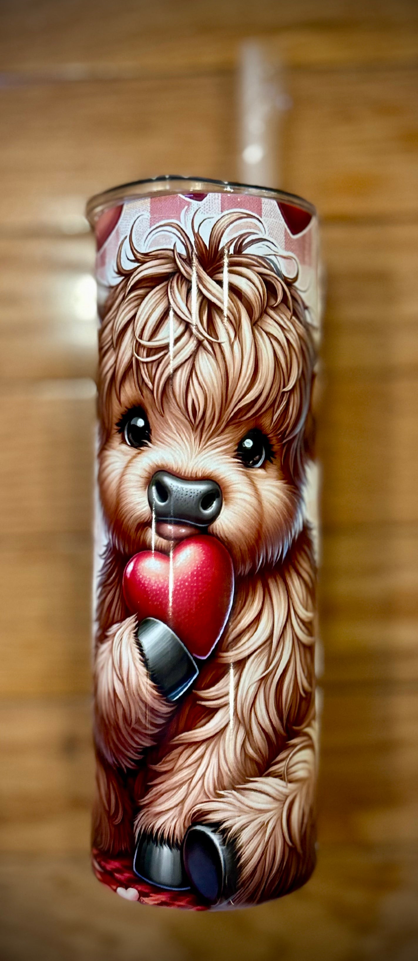 Discover sophistication in every sip with our 20-ounce skinny tumbler. Crafted from durable double-wall stainless steel, this chic tumbler is accompanied by a convenient sliding plastic lid and straw for a spill-free experience. Embrace the charm of Valentine’s Day with our endearing Highland cow design, meticulously sublimated onto the surface. Elevate your beverage style effortlessly with this sleek and practical companion.