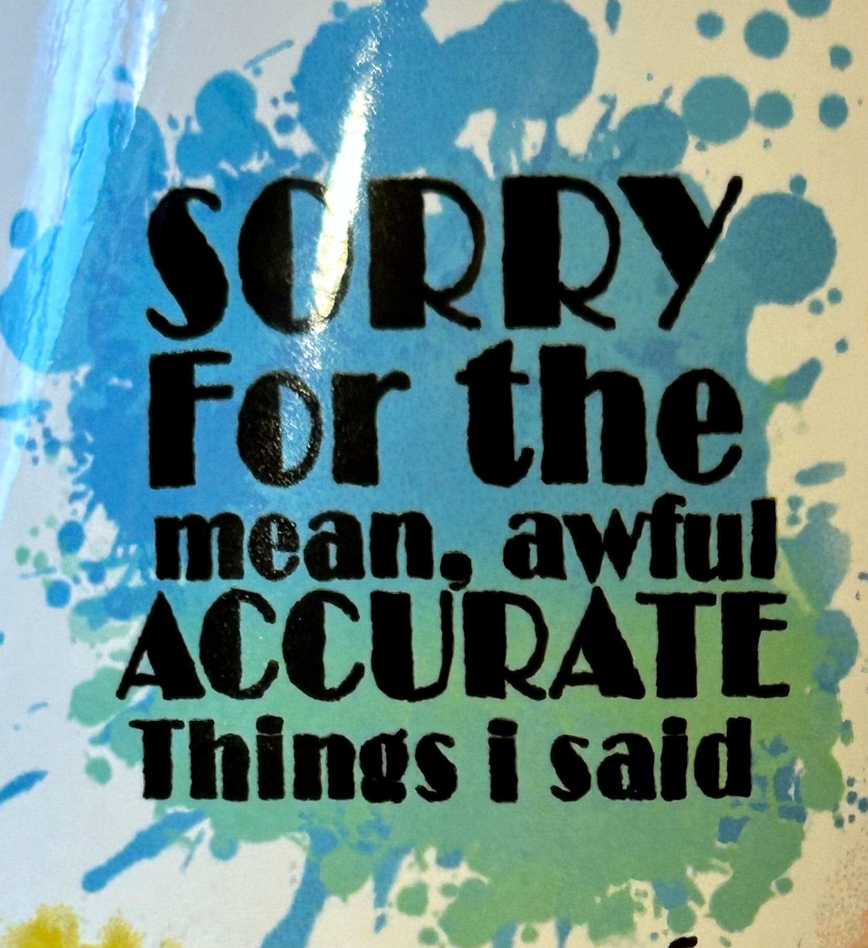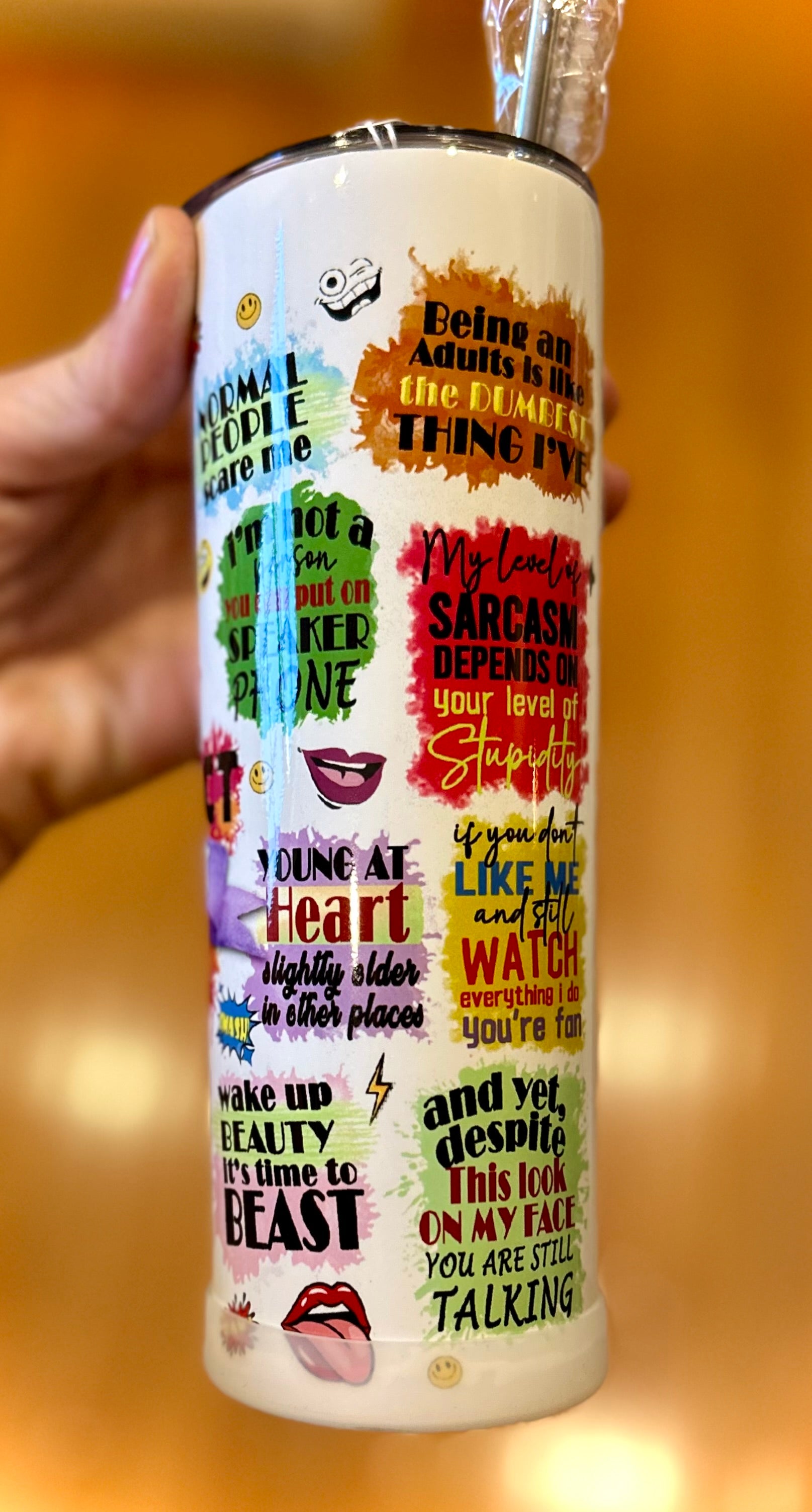 Elevate your drinkware collection with our 20-ounce stainless steel tumbler! This double-walled marvel ensures your beverages stay hot or cold for hours. Featuring a vibrant sublimated design, it showcases a variety of hilarious sayings that are sure to bring a smile to your face. Perfect for anyone who loves to add a touch of humor to their daily routine.