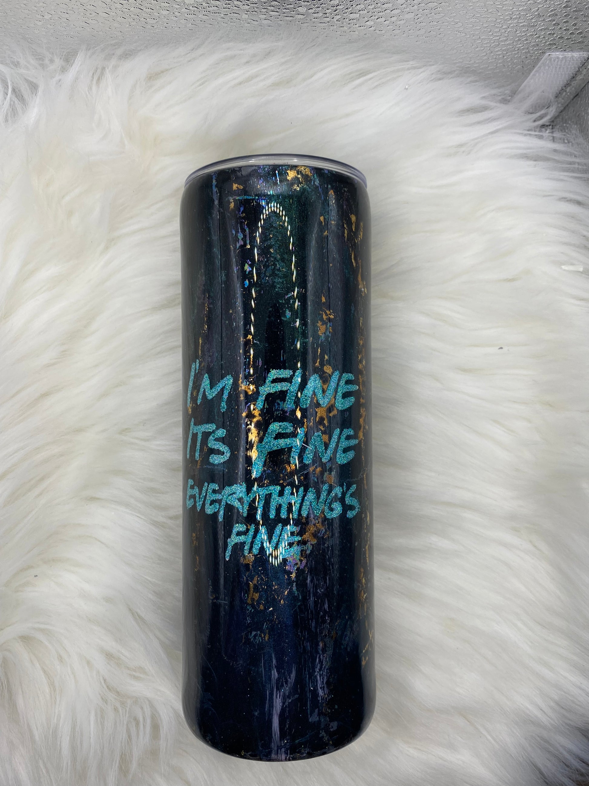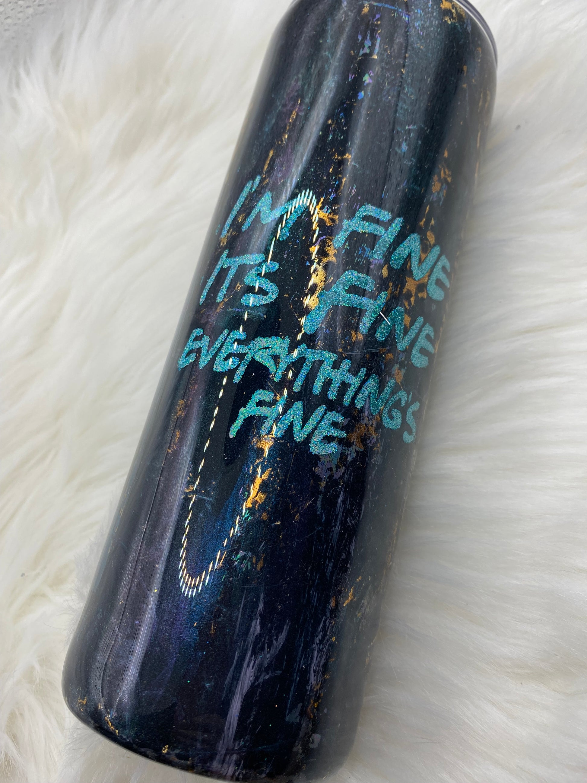 Stay hydrated and showcase your carefree spirit with our 20-ounce Skinny Tumblr. Its chaotic and fun design serves as a cheerful reminder that even in the midst of life’s craziness, you have the resilience to handle it all. Enjoy your beverages with a touch of whimsy and embrace the mantra, “I am fine, everything’s fine,” as you navigate through life’s beautiful chaos.