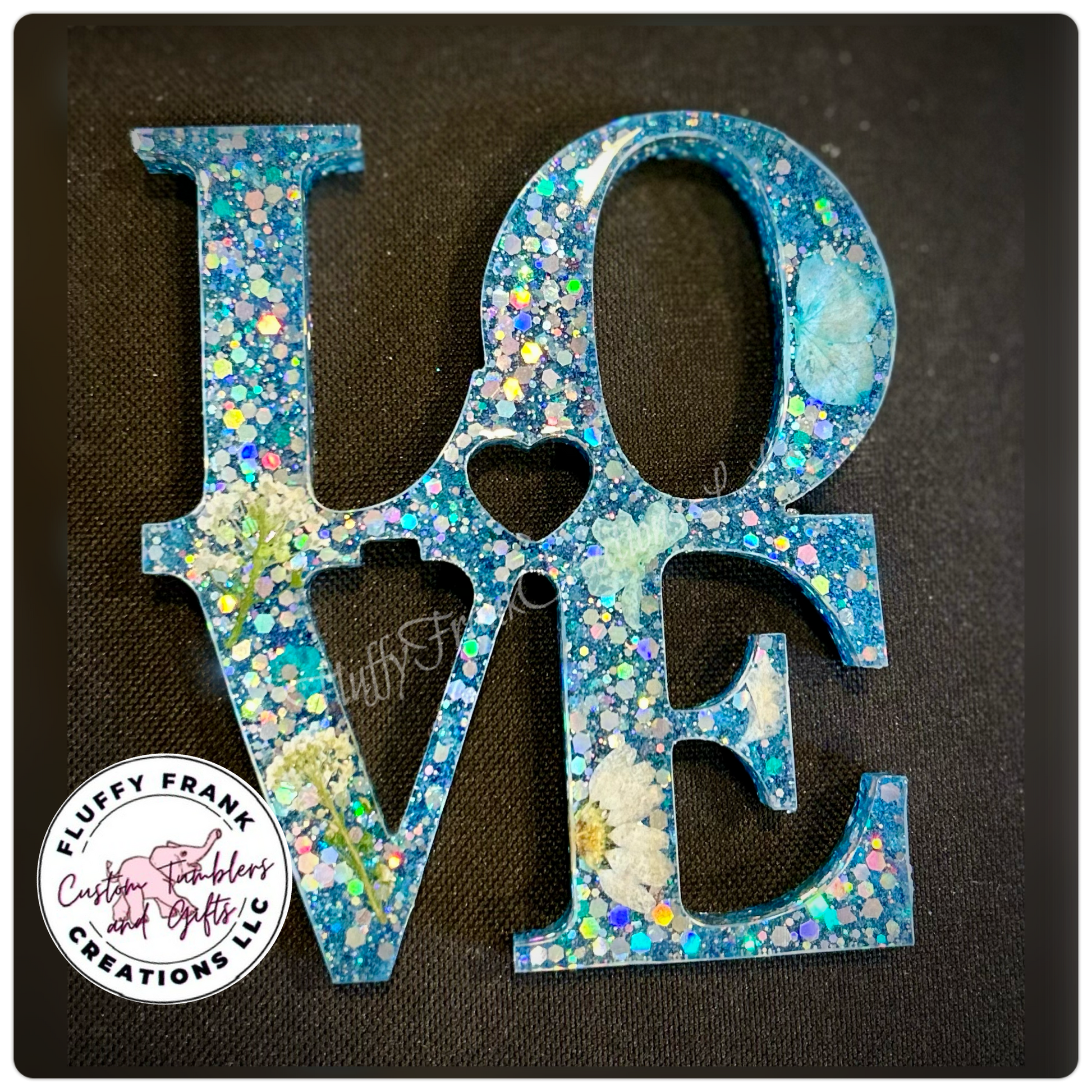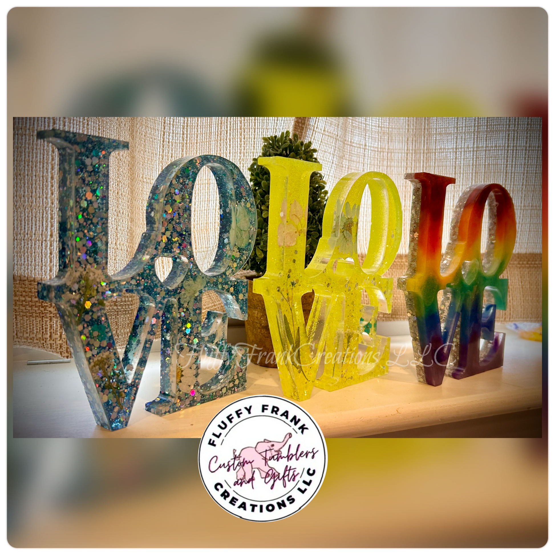 Made from high-quality resin - the LOVE lettering is 4.75” tall and 4”i wide. It's thick at 1/2” deep Each piece is handmade and hand poured in our studio using only the finest quality epoxy resin. This sign is perfect to place inside of your home on a coffee table, or to highlight family photos