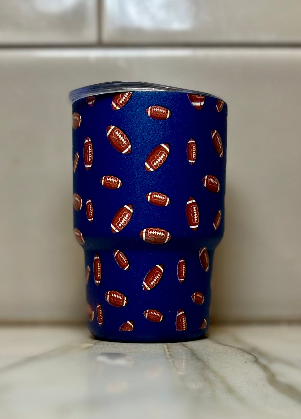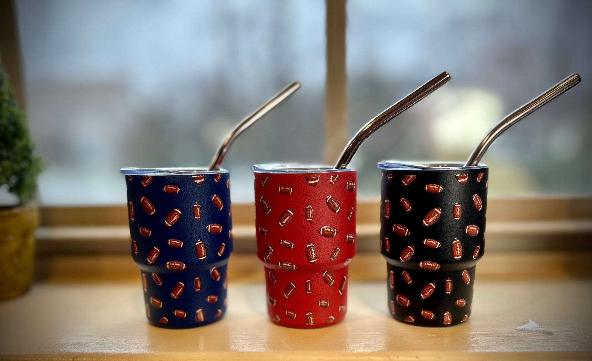 Elevate your game day experience with our Mini Football Tumblers! These 3oz Tumbler shot glasses come in three vibrant colors and are perfect for your winning shots. Limited stock available. Made with double walled stainless steel and includes a convenient lid and stainless straw. Score big with every sip.