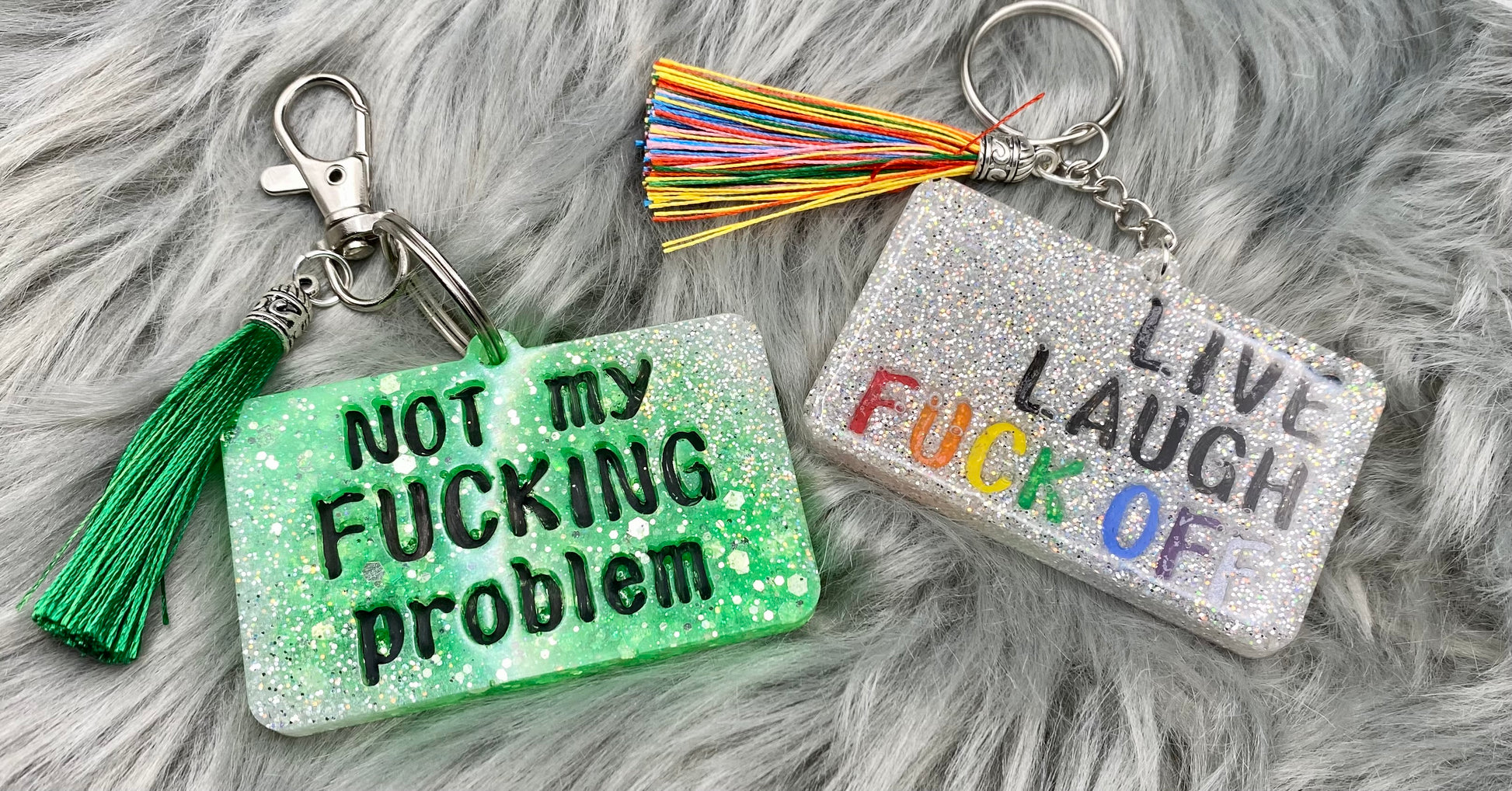 “Not my F**king problem” & “live, laugh” keychains measure 1.75” x 2.75”