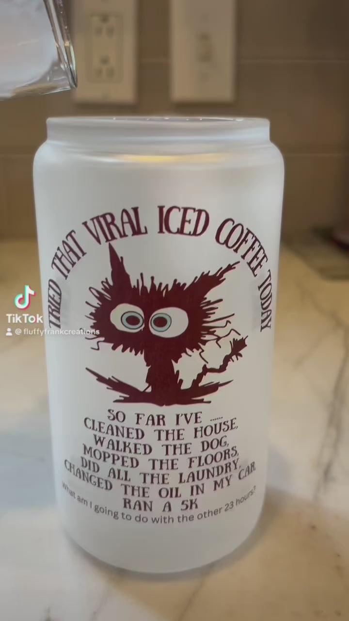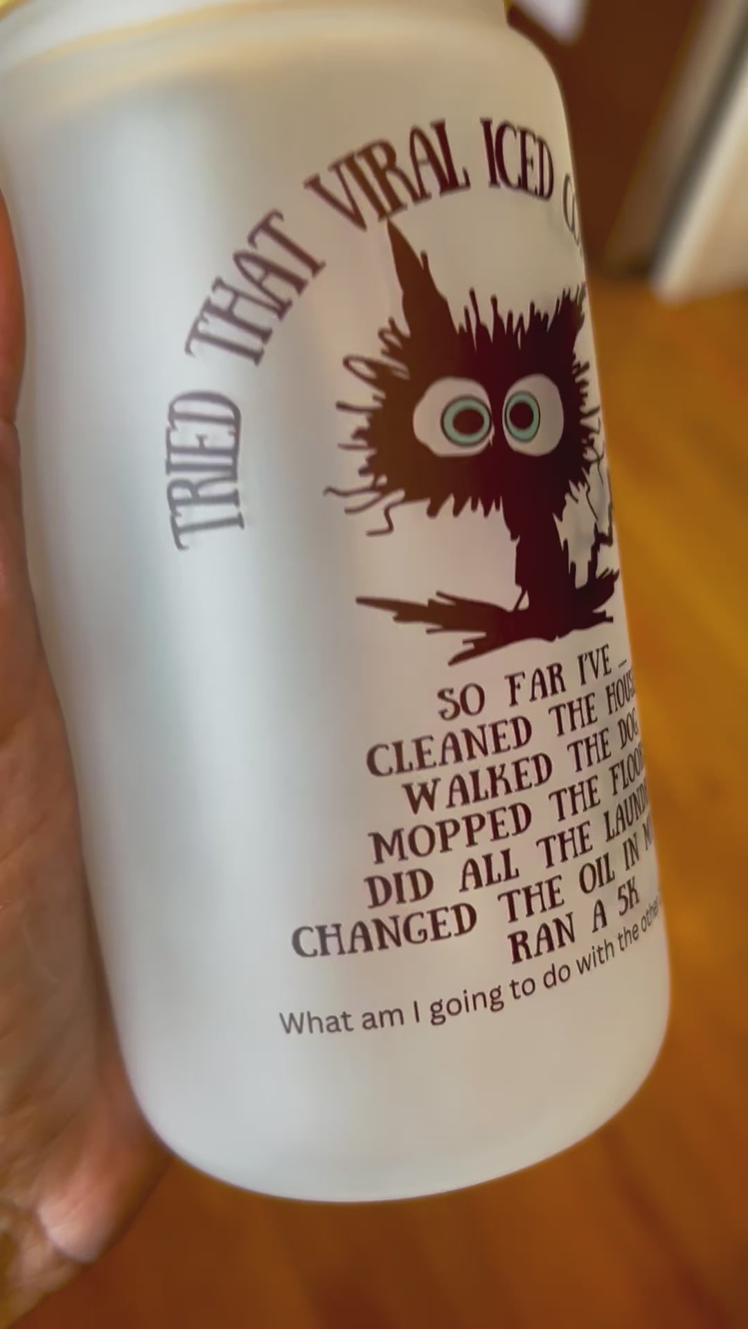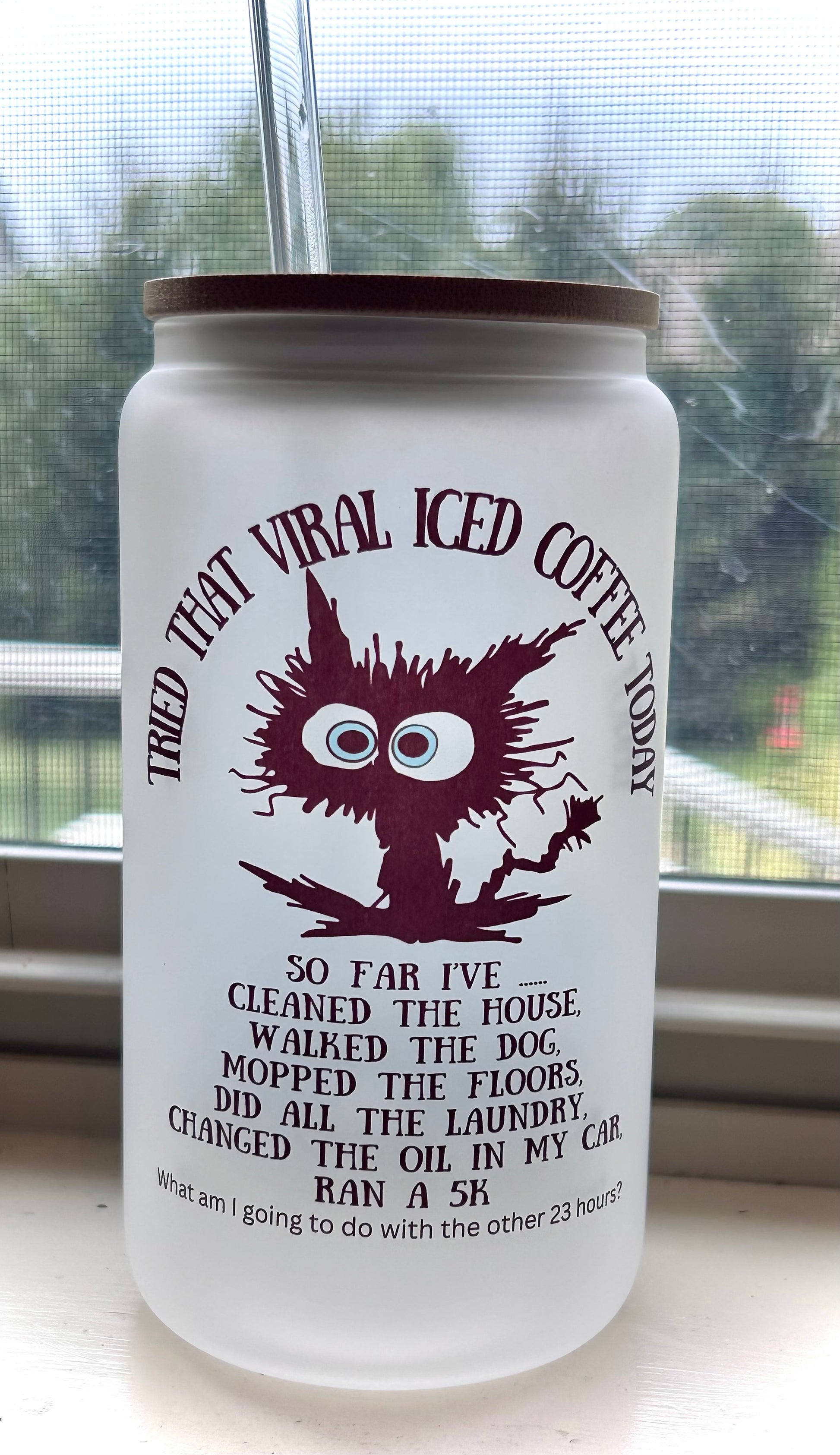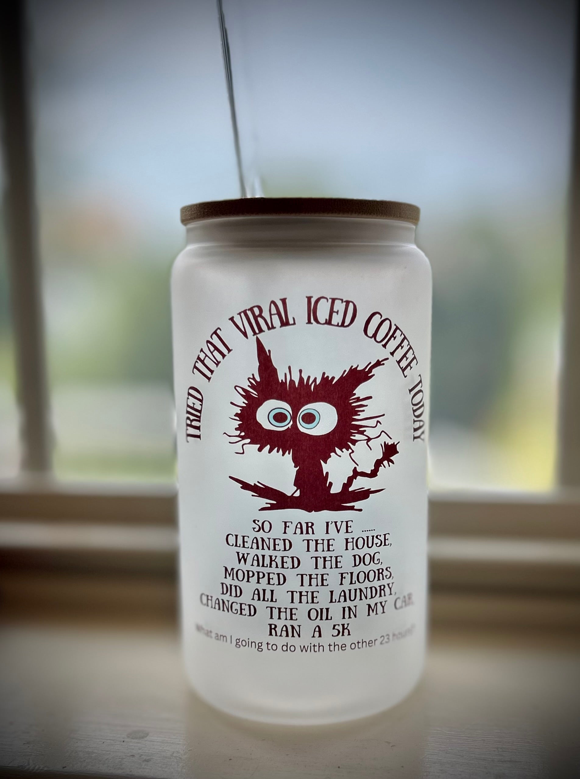 "Experience the latest caffeinated trend with Over Caffeinated Kitty! Our 16 oz frosted can glass includes a bamboo lid and glass straw for eco-friendly sipping. The sublimated design is inspired by Kylie Pitts' viral TikTok coffee drink. Say goodbye to boring coffee and hello to an elevated caffeine experience!"
