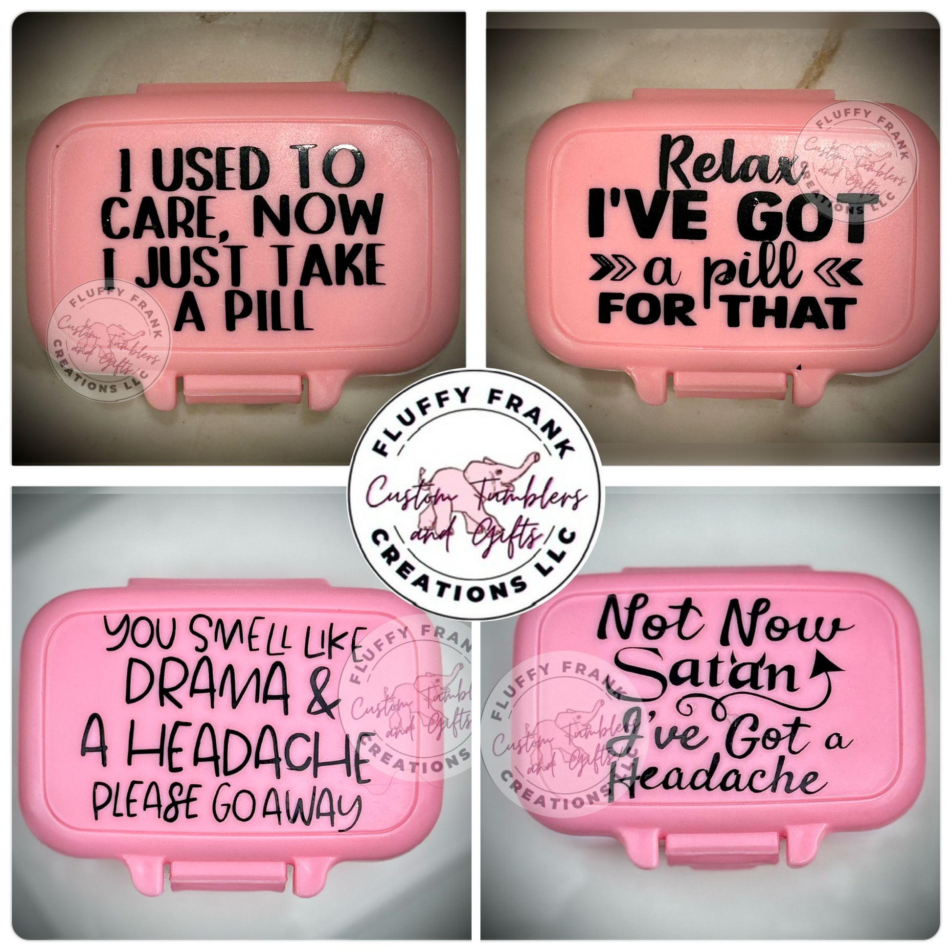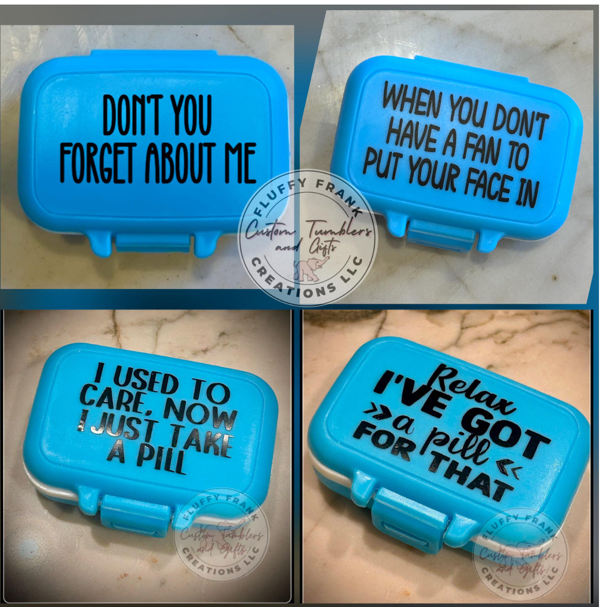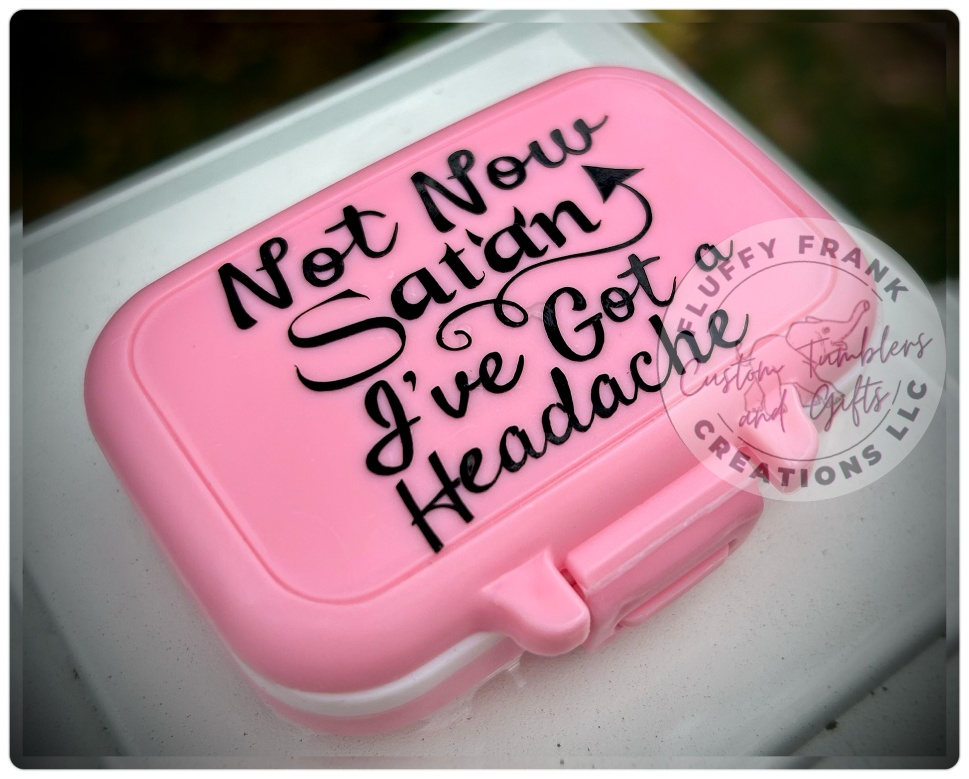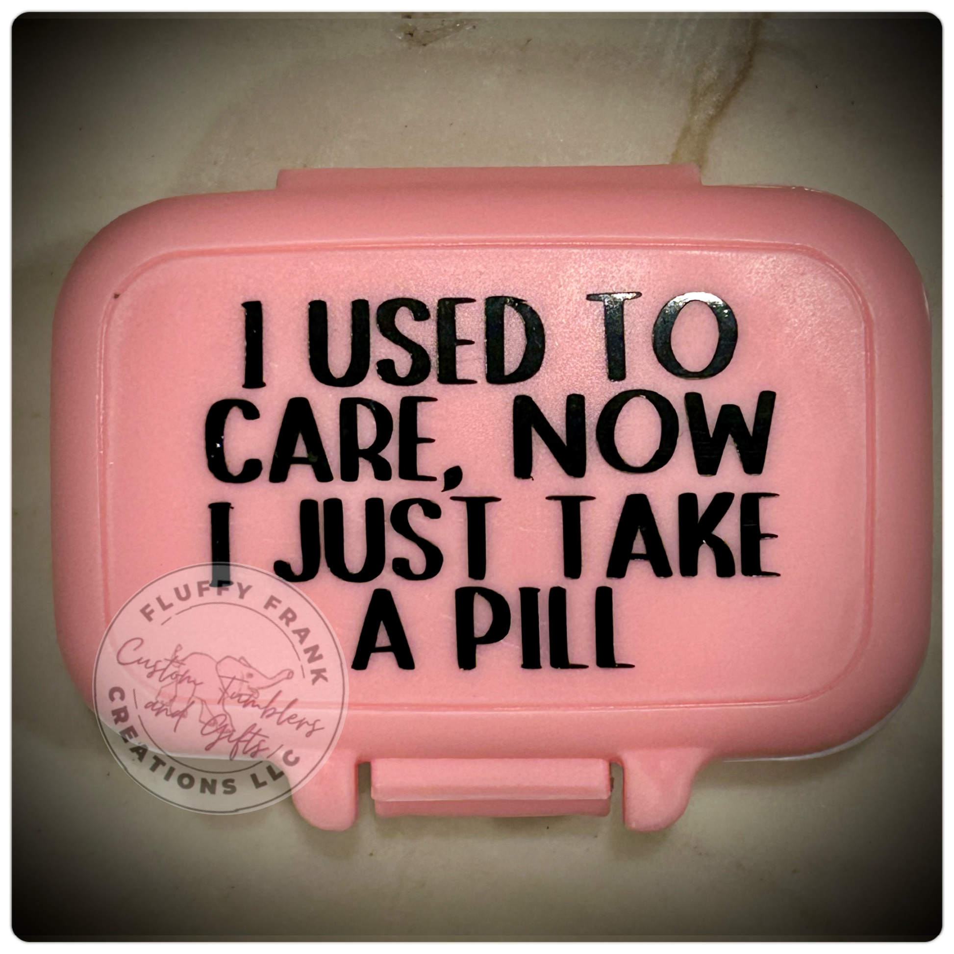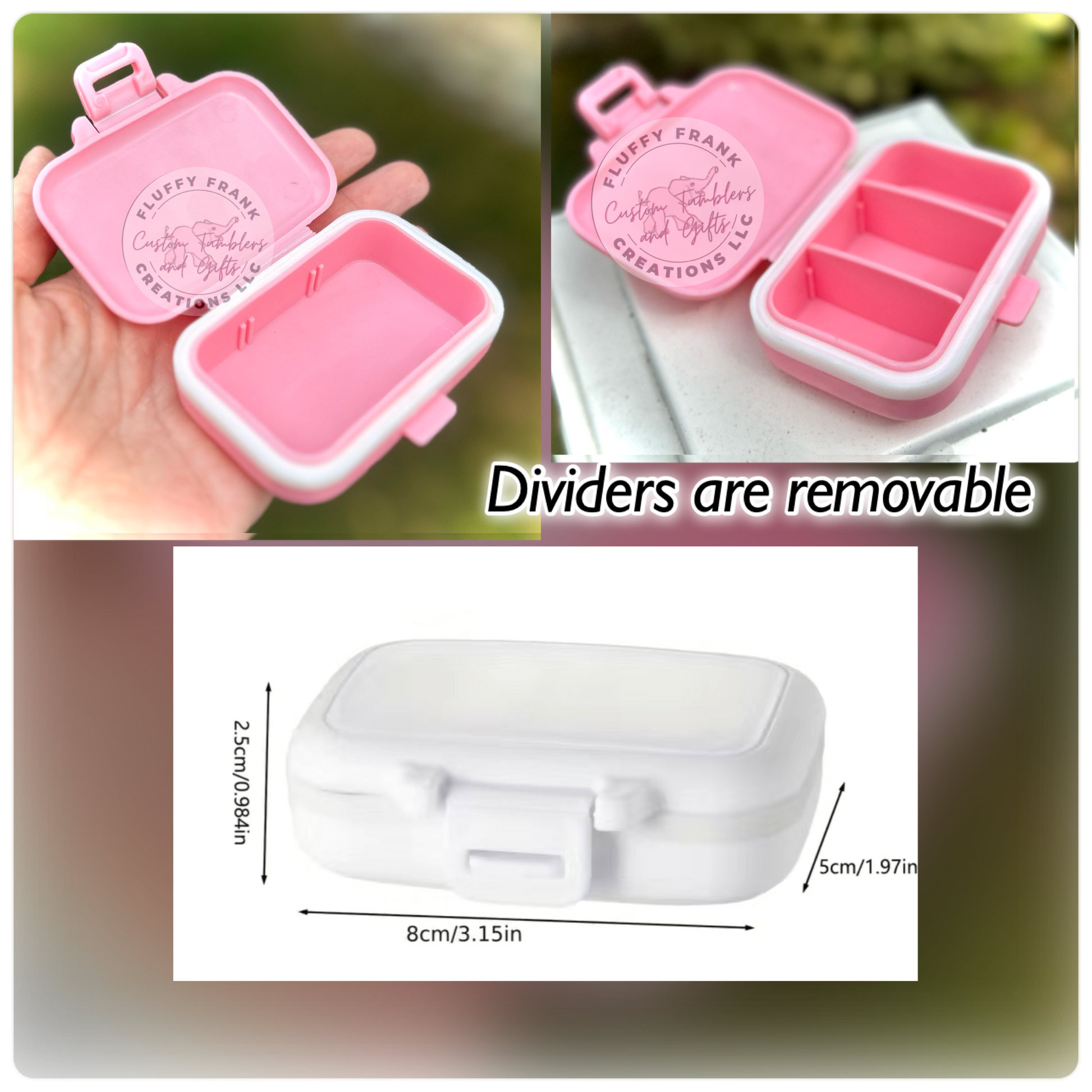 Store your pills in style with this cute Pill Box. It's just the right size - 3.15" x 1.97" - to fit in your pocket or purse. A locking lid and removable dividers with 3 sections will keep your medications organized and secure. Plus, you can choose from two sayings or create your own custom saying! A silicone gasket ensures a tight seal. Get organized with this awesome pill box!