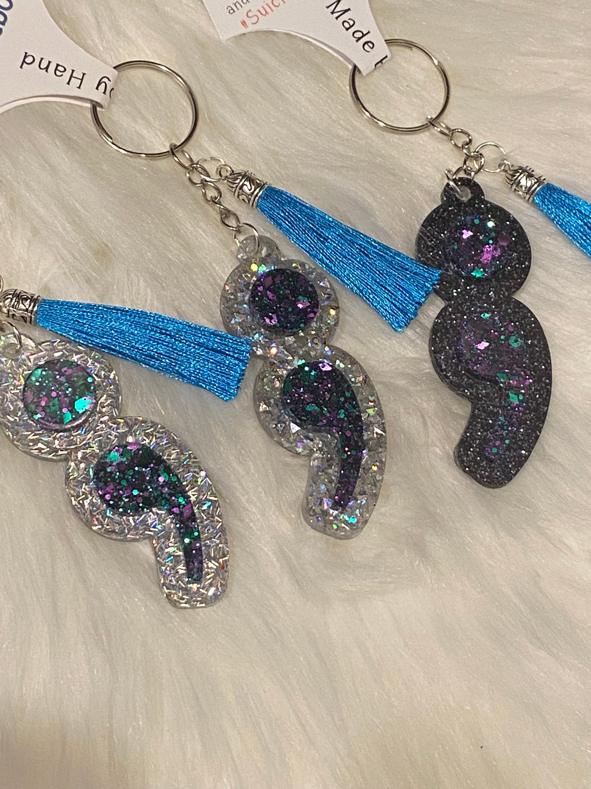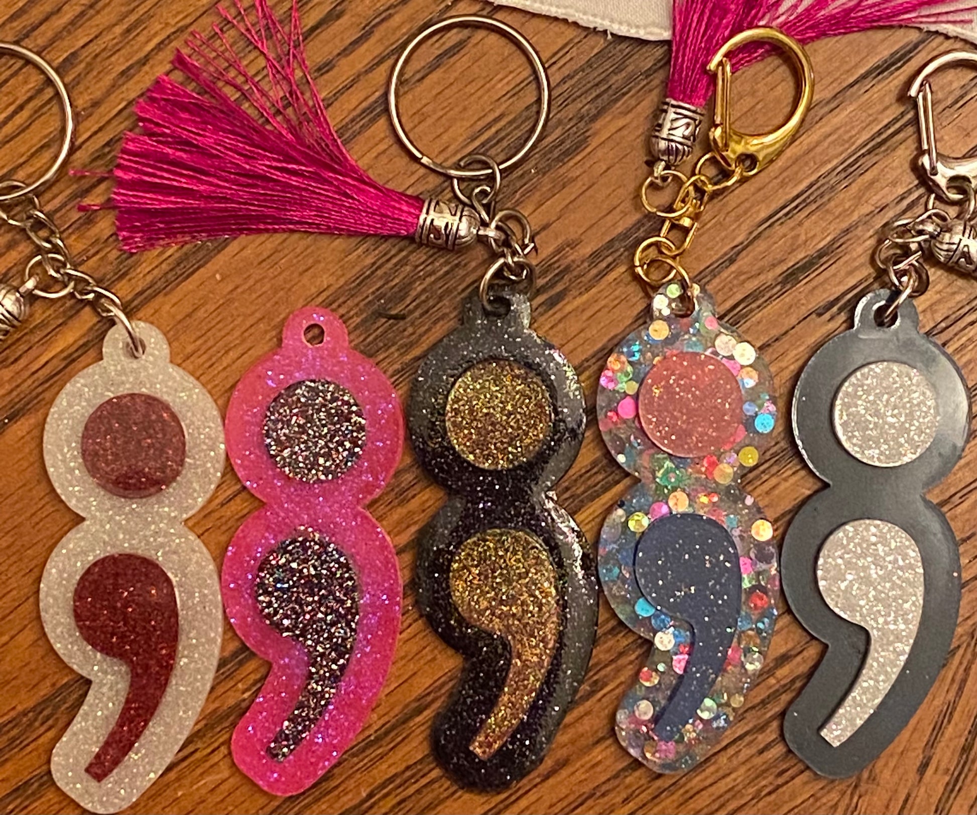 Made to order semi-colon resin keychain. Promotes / supports mental health awareness.