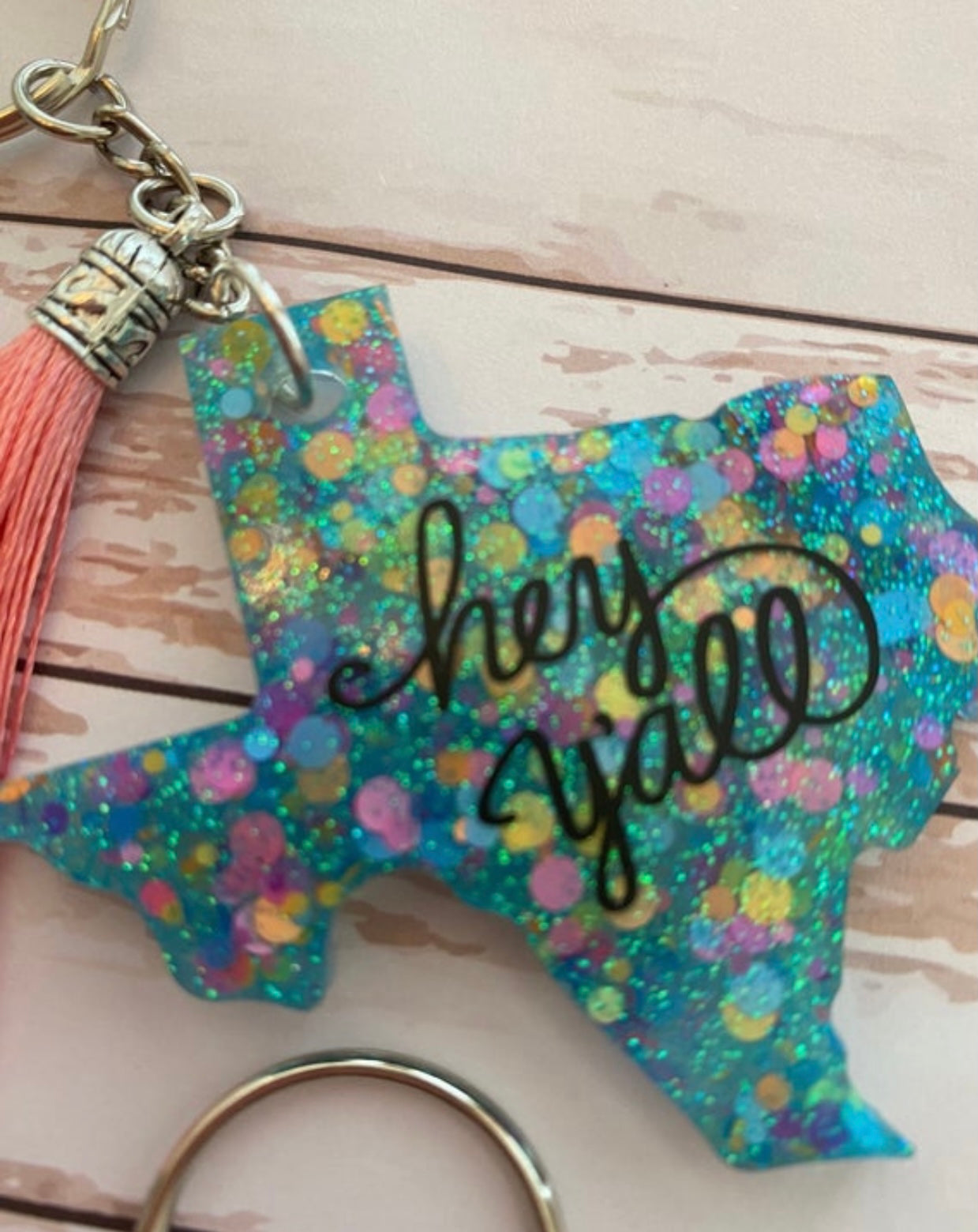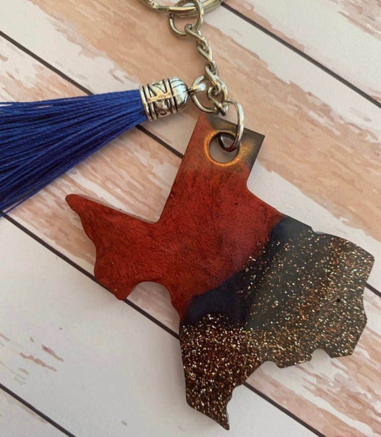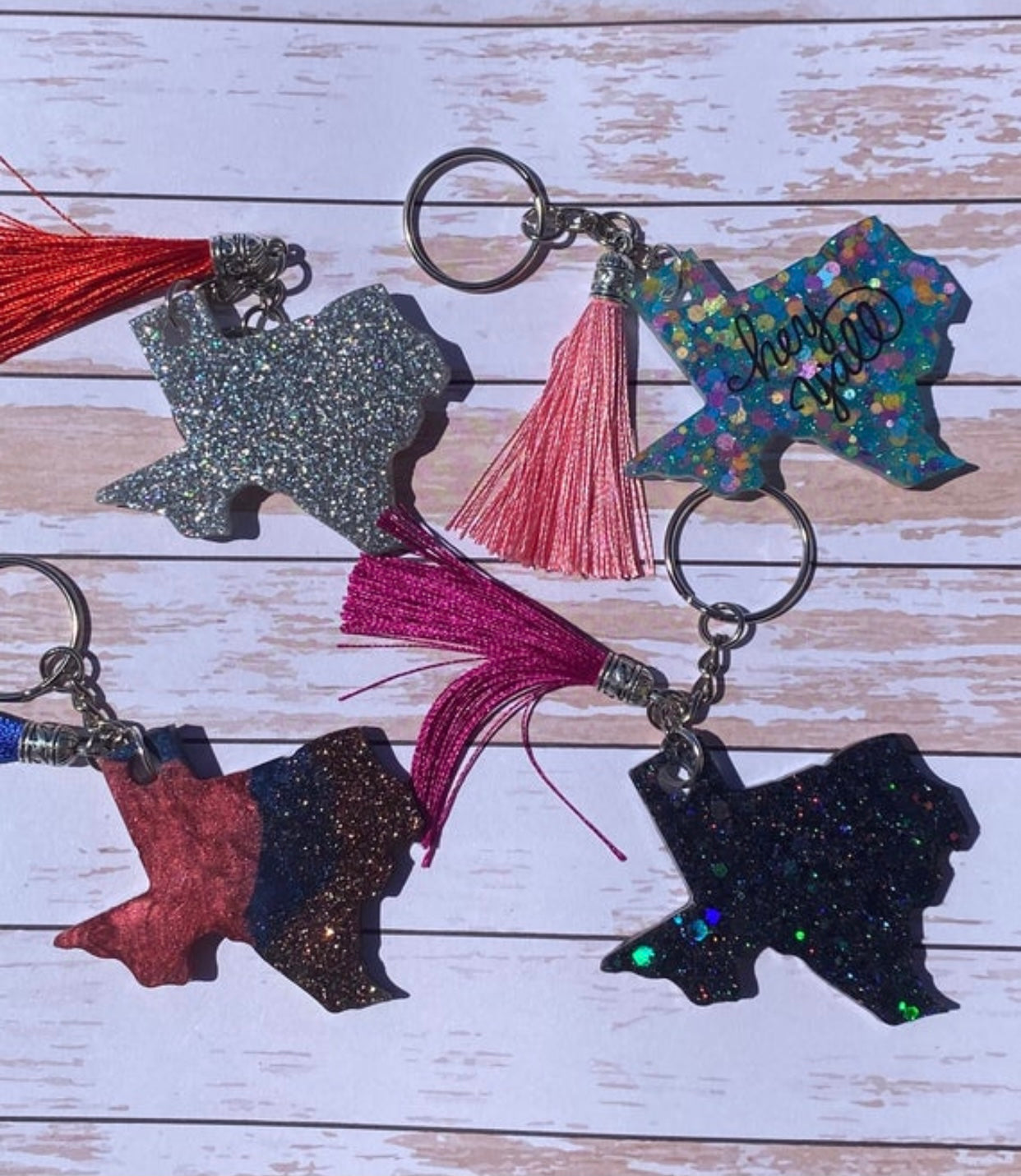 Show your Texas pride!! Super cute poured resin keychain with tassel. Hundreds of color options available!! Please note colors you want in the “notes to seller” To see color options / CLICK HERE.