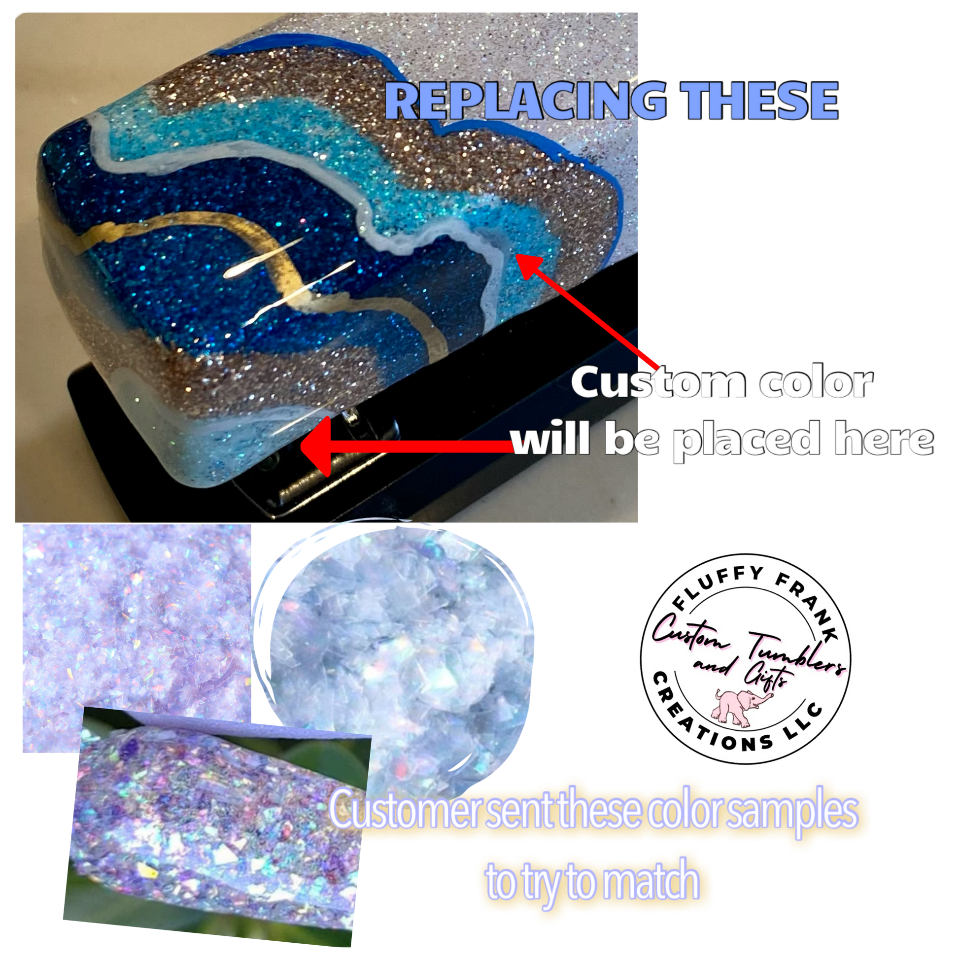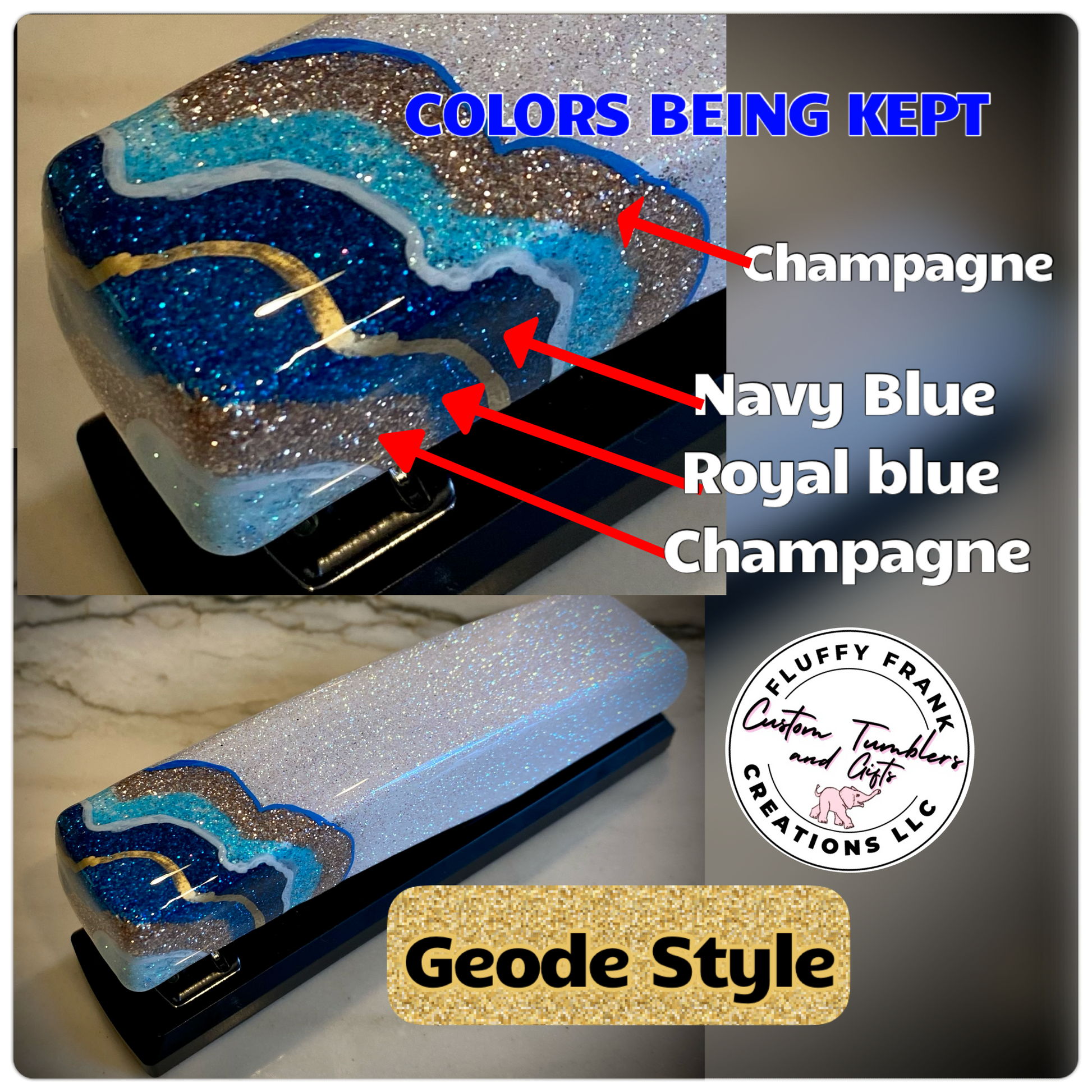 • Before final application, you will receive a color sample of the geode pattern using the updated colors for review and approval. Production will begin once the sample is approved.