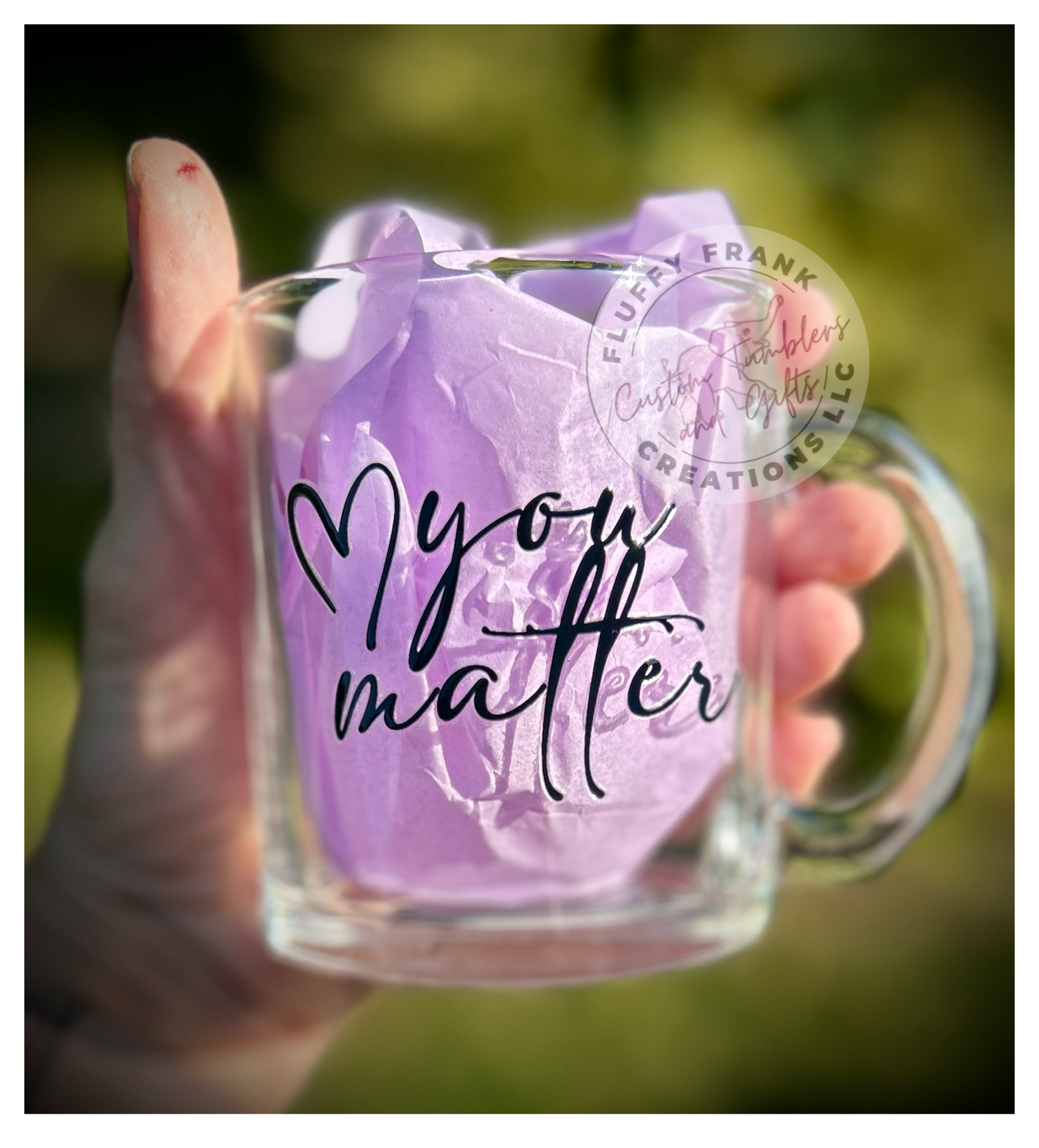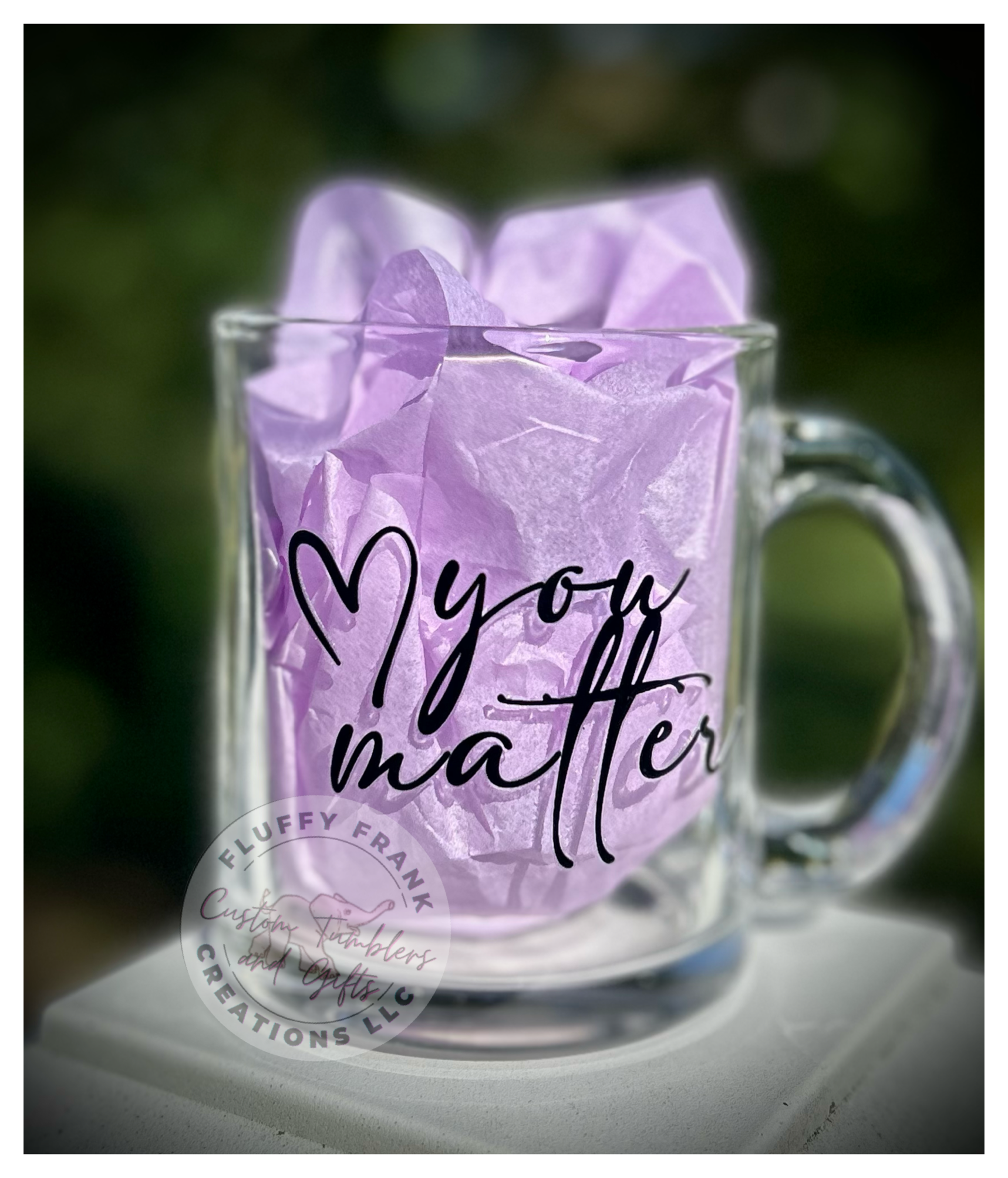 This 12oz glass mug is perfect for showing your support for mental health awareness. Sturdy and stylish, the mug features a permanent waterproof decal featuring the inspiring phrase "You Matter." Enjoy your favorite beverage and show your support for mental health awareness with this meaningful glass mug.